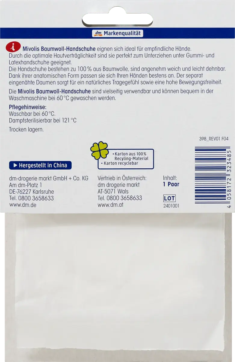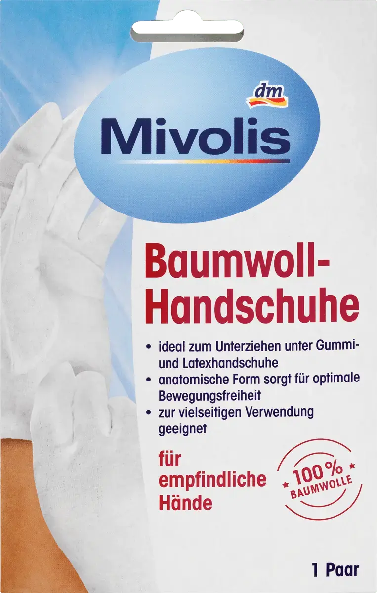 Хлопок Mivolis -Перчатки идеально подходят для чувствительных рук. Благодаря оптимальной совместимости с кожей они идеально подходят для ношения под резиновыми и латексными перчатками. Перчатки изготовлены из 100% хлопка, приятные на ощупь и слегка эластичные. Благодаря своей анатомической форме они идеально адаптируются к вашим рукам. Отдельно вшитый большой палец обеспечивает естественное ощущение и высокую свободу движений.