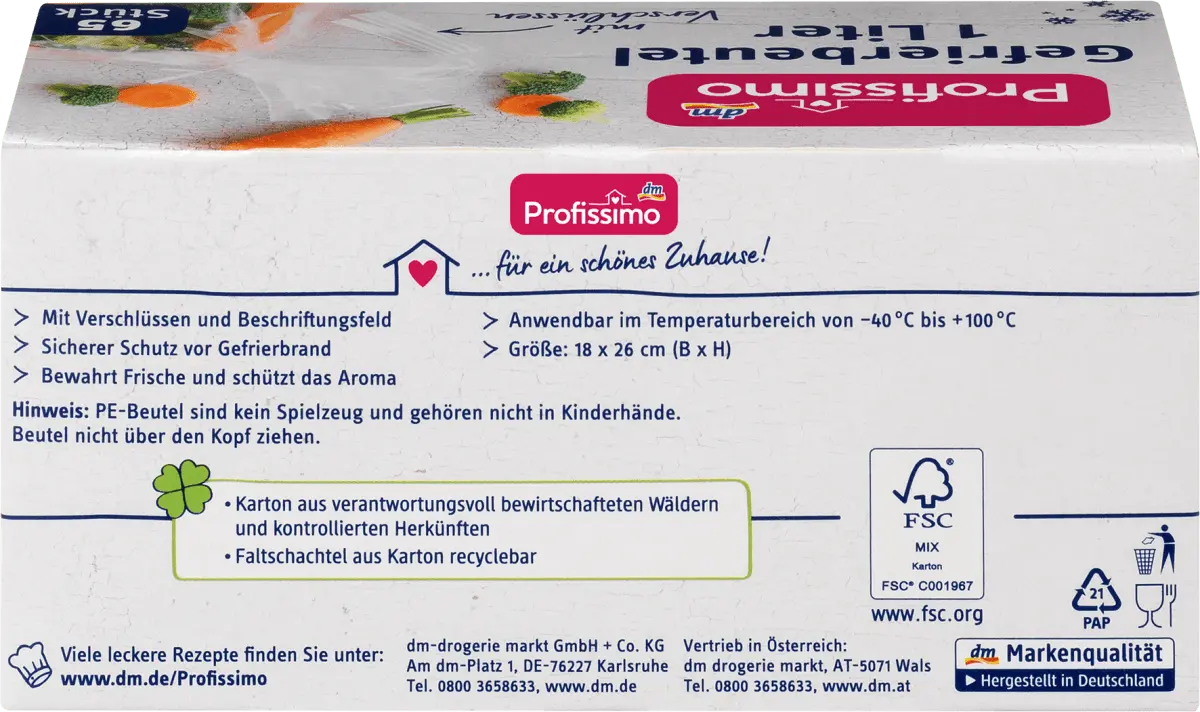 Объем 1 литр Пакеты для заморозки Profissimo со стабильной трехслойной фольгой идеально подходят для замораживания мяса, готовых блюд и многого другого, что делает их идеальными помощниками на кухне: включая практичные застежки.