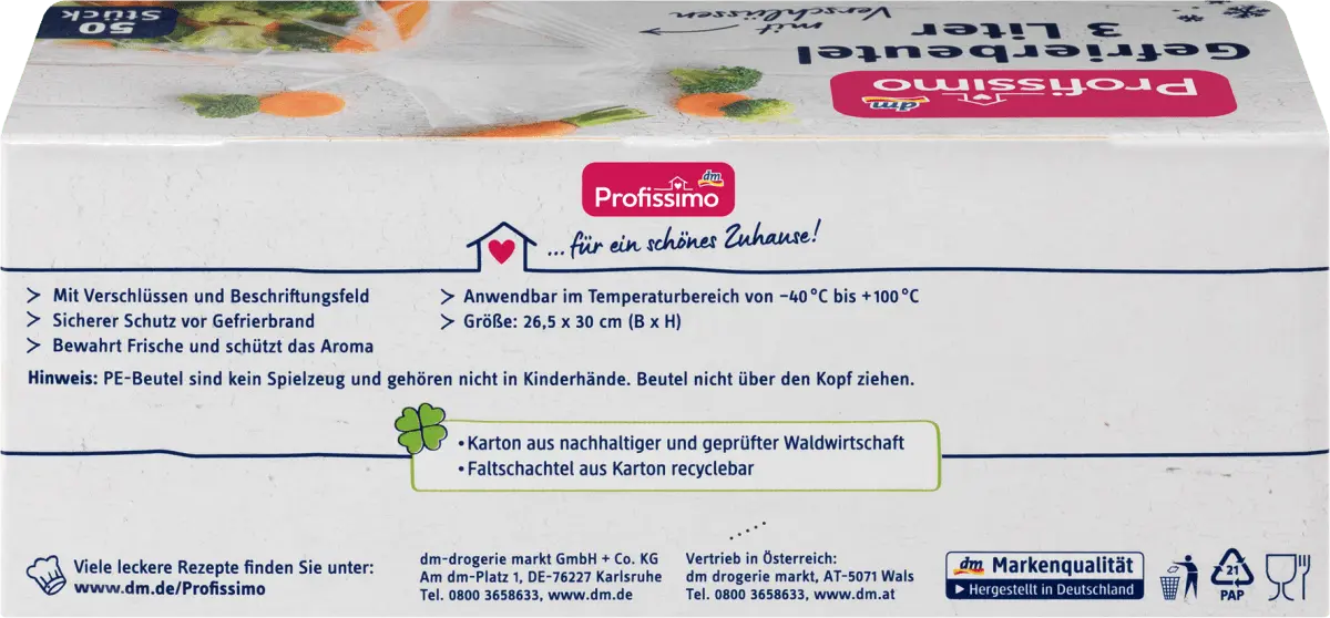 Объем 3 литра Пакеты для заморозки Profissimo, изготовленные из прочной трехслойной пленки, идеально подходят для замораживания мяса, готовых блюд и многого другого, что делает их идеальным помощником на кухне, включая практичные застежки.