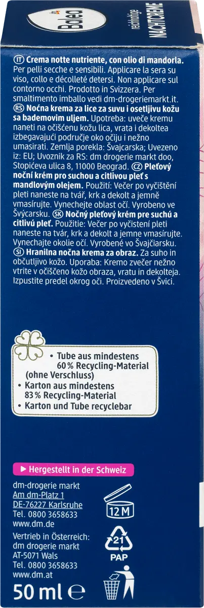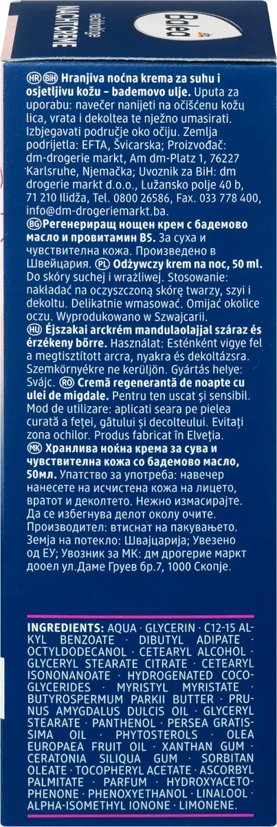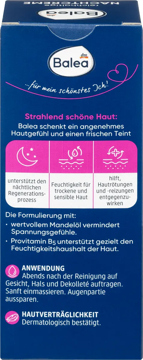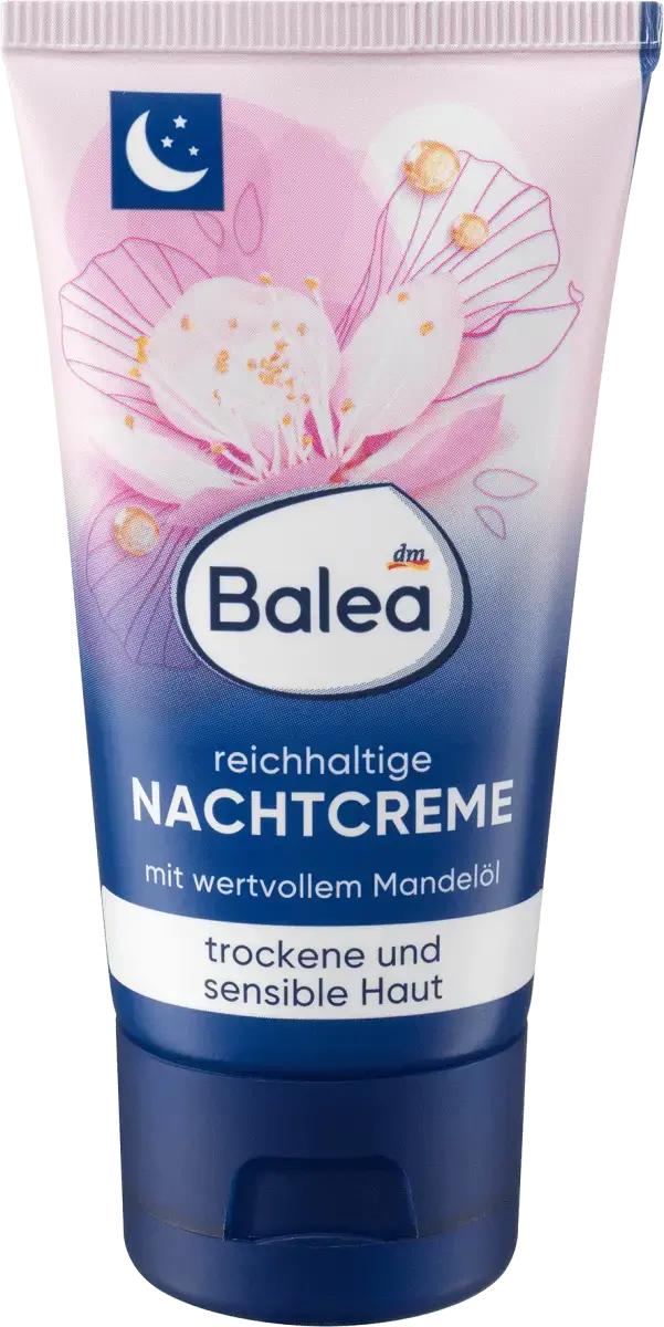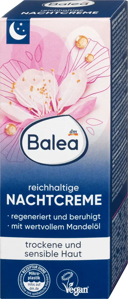 Насыщенный ночной крем от Balea с ценным миндальным маслом снижает чувство напряжения и обеспечивает целенаправленную поддержку водного баланса кожи с помощью провитамина B5. Помогает противодействовать покраснению и раздражению кожи. Для сияющей красивой кожи, приятного ощущения кожи и свежего цвета лица. Рецептура без микропластика и водорастворимых, чисто синтетических полимеров.
