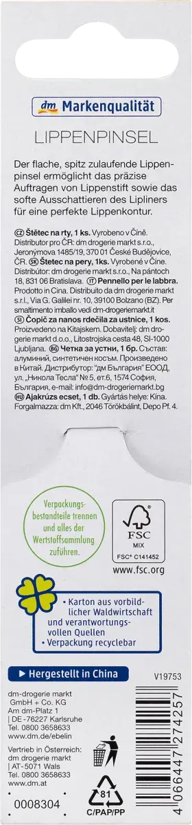 Плоская сужающаяся кисточка для губ пастельного цвета от ebelin позволяет точно наносить помаду. Кроме того, узкая кисть идеально подходит для мягкой растушевки карандаша по контуру губ.