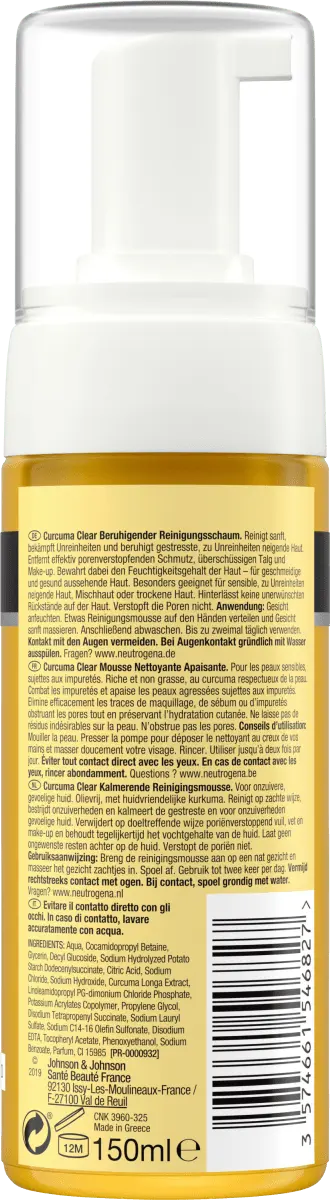 Успокаивающая очищающая пенка Neutrogena Curcuma Clear мягко очищает, борется с загрязнениями и помогает предотвратить их появление. В то же время он успокаивает стрессовую кожу, склонную к загрязнениям. Он эффективно удаляет закупоривающие поры грязь, излишки кожного сала и макияж, сохраняя при этом влажность кожи, делая ее эластичной и здоровой на вид. Особенно подходит для чувствительной, склонной к загрязнениям кожи, комбинированной и сухой кожи. Не оставляет нежелательных следов на коже и не закупоривает поры.