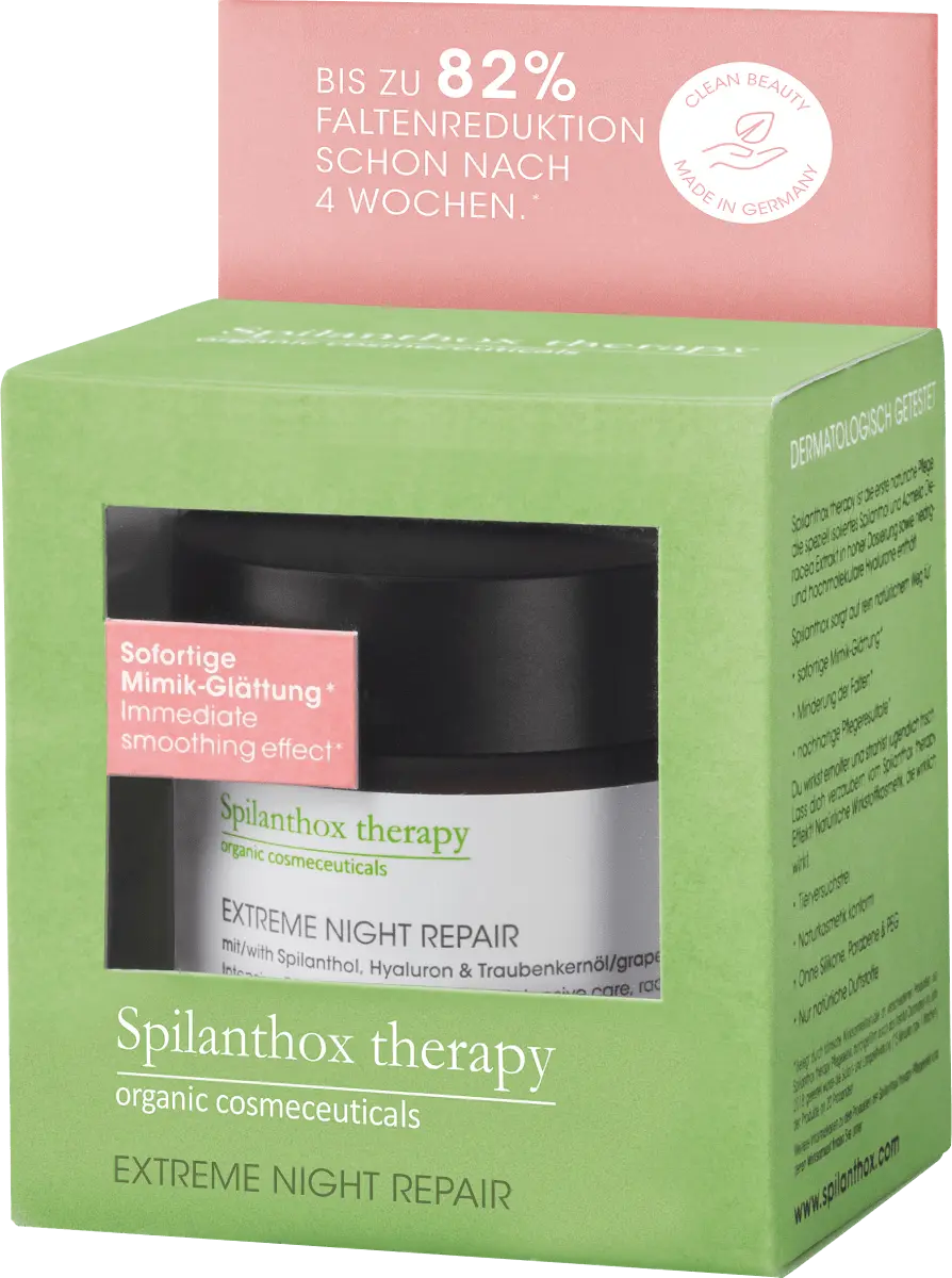 Насыщенный ночной крем для оптимальной регенерации со спилантолом, гиалуроновой кислотой с короткой и длинной цепью, маслом виноградных косточек, миндальным маслом и фитоскваланом мгновенно расслабляет и разглаживает мимику лица. Тонкие линии сводятся к минимуму, структура кожи укрепляется и получает устойчивый уход даже за очень сухой кожей. Дополнительный цинк делает кожу чистой и прозрачной.