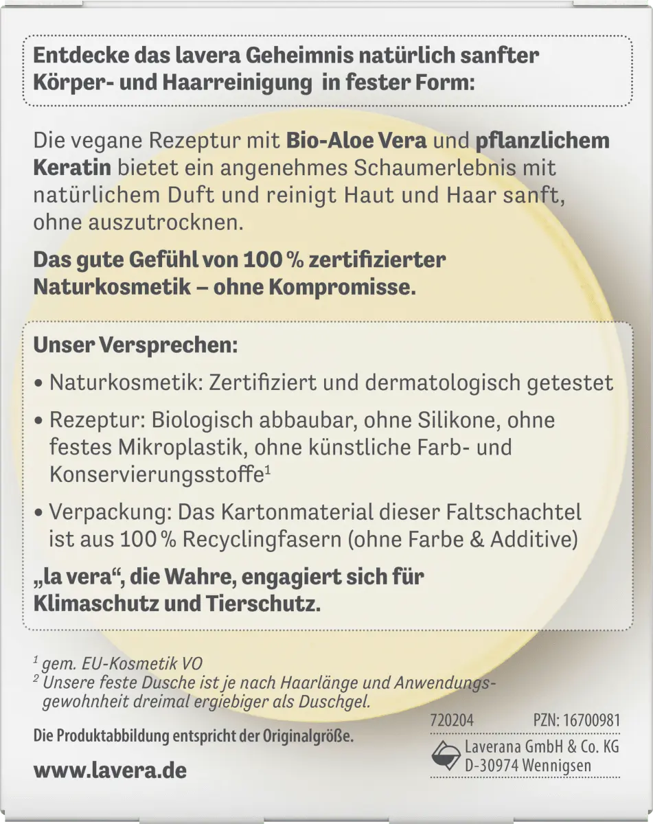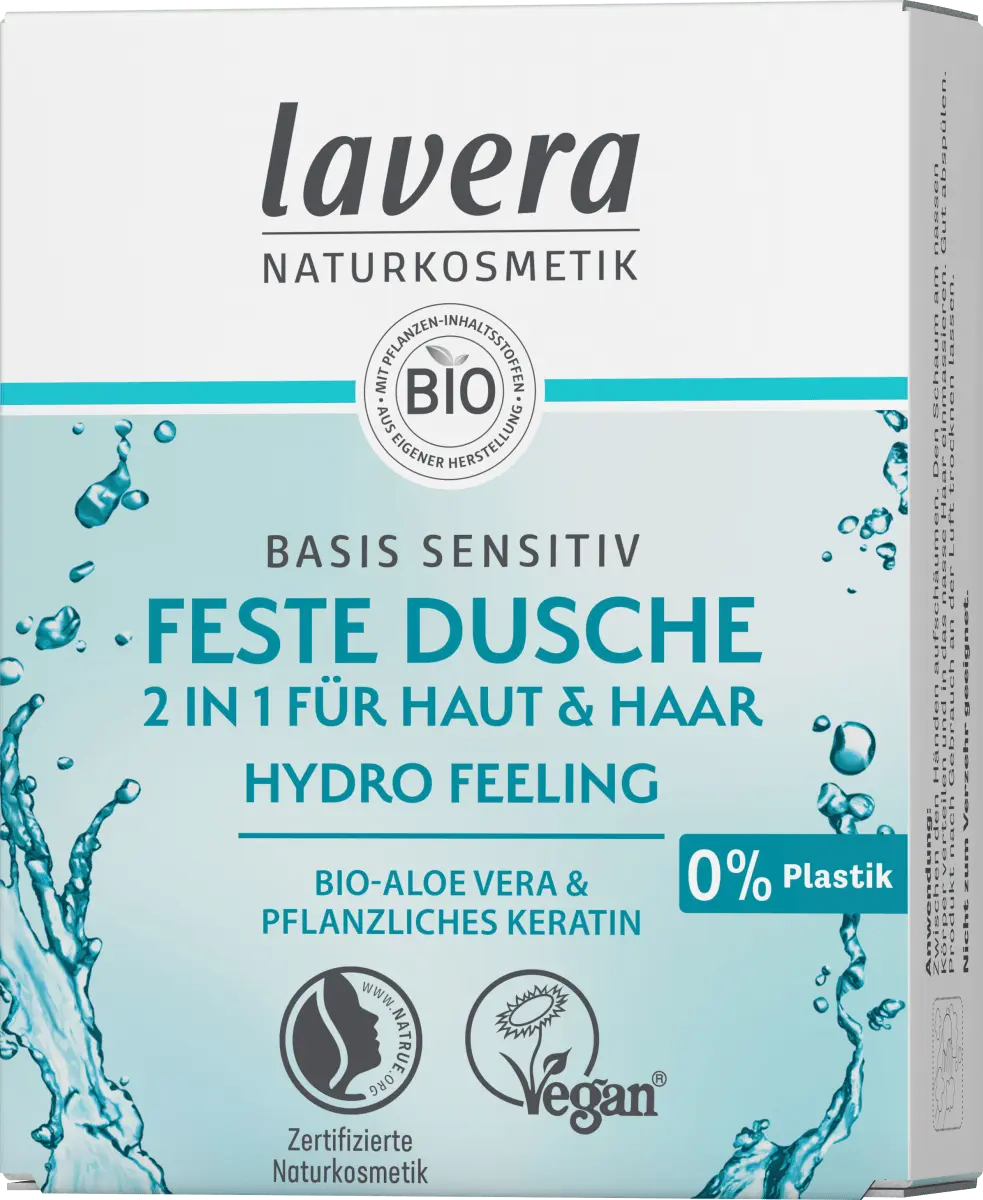 Естественно нежное очищение тела и волос в твердом виде: Lavera Solid Shower Solid Shower 2in1 Basis Sensitiv создан на основе веганский рецепт с органическим алоэ вера и растительным кератином. Он обеспечивает приятное пенообразование с освежающим ароматом и мягко очищает кожу, не пересушивая ее. Для ощущения ухоженной кожи сразу после применения. *Упаковка содержит не менее 70% переработанных материалов.