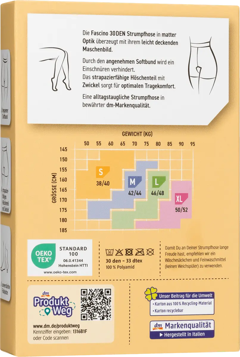 Колготки Fascino 30 DEN с матовым эффектом впечатляют слегка матовым сетчатым рисунком. Удобный мягкий пояс предотвращает сдавливание. Прочная секция трусиков с ластовицей обеспечивает оптимальный комфорт. Колготки проверенного качества бренда dm, подходящие для повседневного ношения.
