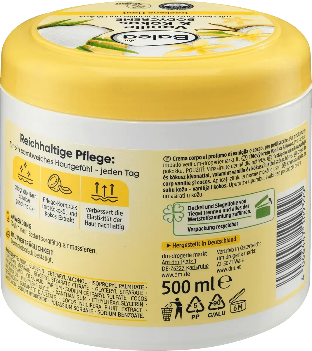 > Крем для тела Balea с ванилью и кокосом идеально подходит для сухой кожи и сохраняет ее заметной эластичностью. Комплекс ухода с кокосовым маслом и экстрактом кокоса улучшает эластичность кожи и обеспечивает ее успокаивающую влагу на срок до 48 часов. Рецептура без микропластика и водорастворимых, чисто синтетические полимеры.