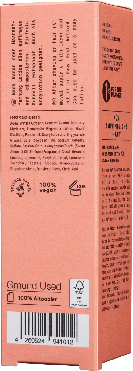 Лосьон для бритья Nø More Hair Après от Nø Cosmetics — это продукт по уходу за кожей, специально разработанный для чувствительной кожи после эпиляции. Обогащенный экстрактом гамамелиса, миндальным маслом и пантенолом, он оказывает успокаивающее и питательное действие. Этот лосьон после бритья означает чистую косметику для ухода – без минеральных масел, силиконов, парабенов, ПЭГ и сульфатов. Он борется с покраснениями и способствует заживлению небольших порезов, обеспечивая при этом интенсивное увлажнение. Nø More Hair Après Shave выполняет миссию по предоставлению эффективных и безопасных средств по уходу за кожей по доступным ценам, чтобы каждый мог научиться любить свою кожу.