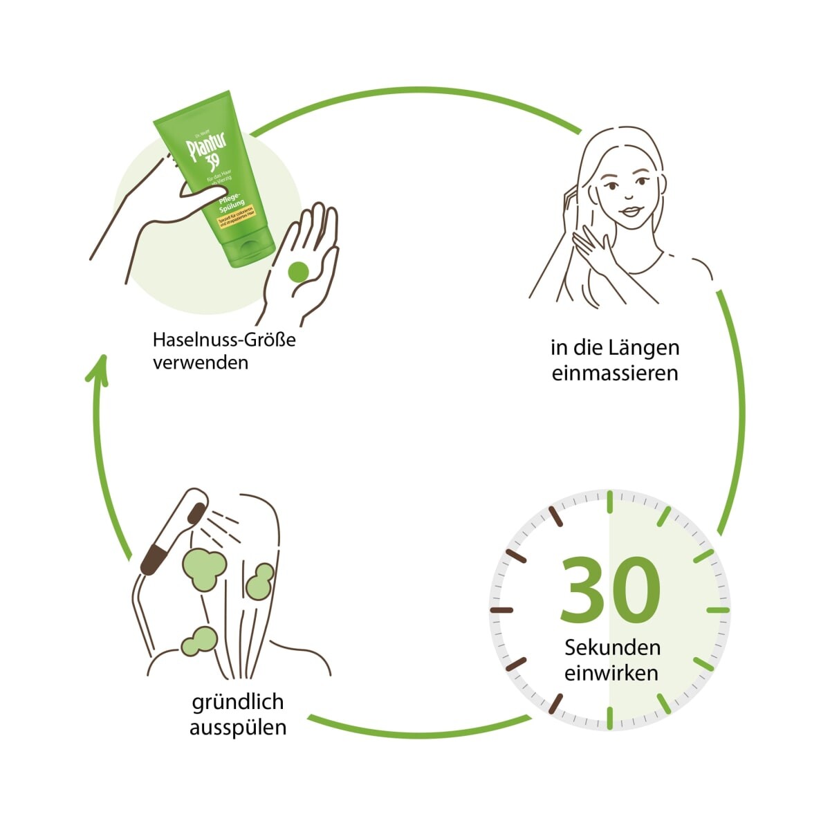 После мытья головы равномерно распределите количество размером с лесной орех по влажным волосам, смойте еще раз через 30 секунд.