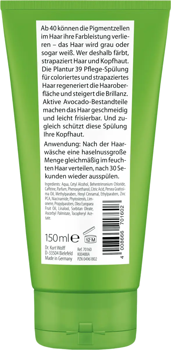 Кондиционер Plantur 39 для окрашенных волос регенерирует поверхность волос и увеличивает яркость цвета. Активные ингредиенты авокадо делают волосы эластичными и легкими в укладке. Этот кондиционер нежно воздействует не только на поврежденные волосы старше 40 лет, но и на кожу головы.