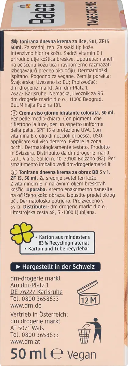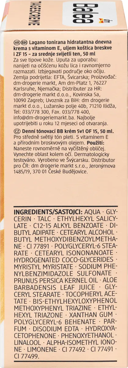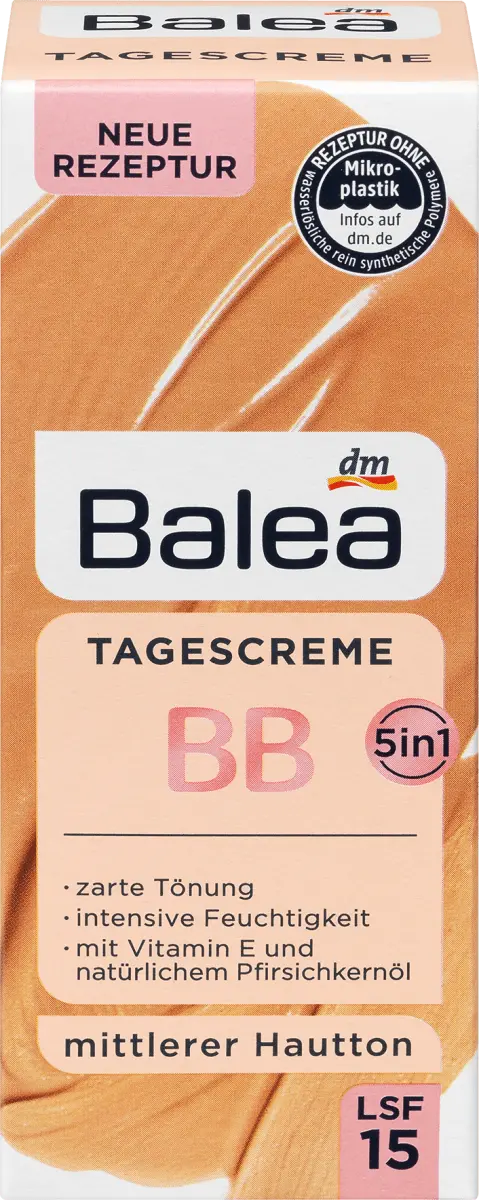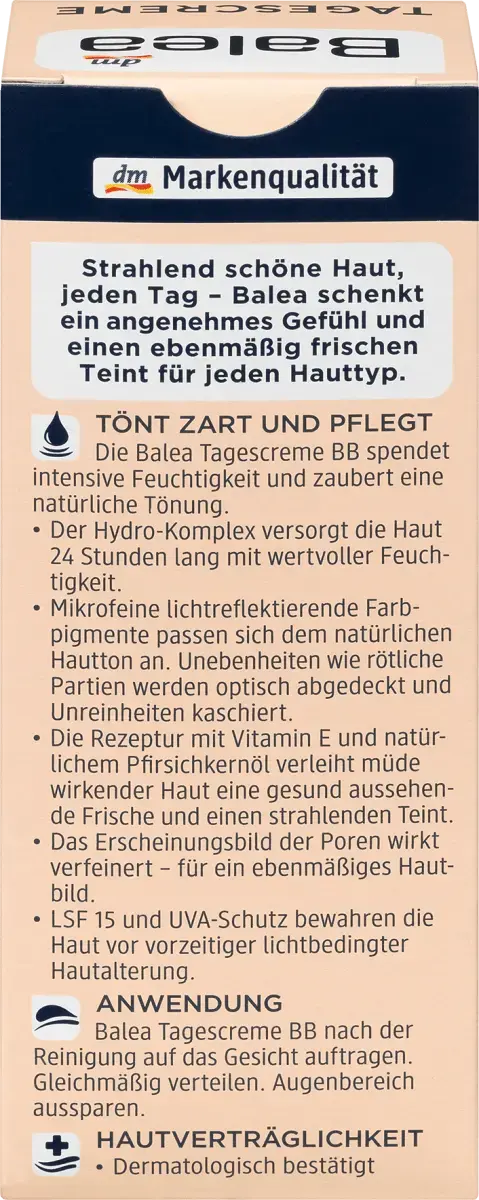 Дневной крем Balea BB для среднего тона кожи SPF 15 вызывает в воображении натуральный оттенок. Гидрокомплекс также обеспечивает кожу влагой на 24 часа. Микродисперсные светоотражающие цветные пигменты адаптируются к естественному тону кожи. Неровности, такие как красноватые участки, оптически покрываются, а загрязнения скрываются. Формула с витамином Е и натуральным маслом персиковых косточек придает уставшей коже свежесть и сияющий цвет лица. Поры выглядят изысканными. SPF 15 и защита от UVA защищают кожу от преждевременного фотостарения. Рецепт без микропластика и водорастворимых, чисто синтетических полимеров.