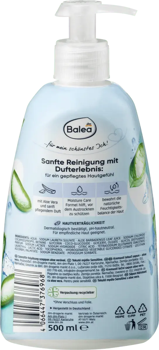 Крем-мыло Balea Sensitive с алоэ вера сохраняет естественный баланс влаги в коже. Формула Moisture Care защищает от высыхания. Рецепт без микропластика и водорастворимых, чисто синтетических полимеров.