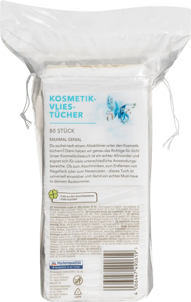 Косметические нетканые салфетки ebelin изготовлены из 100% хлопка и поэтому мягкие, безворсовые и устойчивые к разрыву. Будь то удаление макияжа, лака для ногтей или сморкание — эту ткань можно использовать универсально, и поэтому она просто необходима в вашей ванной комнате.