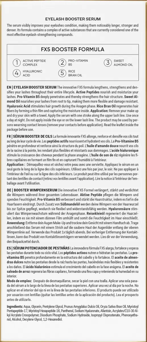 Аква, глицерин, пентиленгликоль, масло Prunus Amygdalus Dulcis, масло отрубей Oryza Sativa, миристоил пентапептид-17, миристола гексапептид-16, пантенол, гиалуронат натрия, аллантоин, Акрилаты / C10-30-алкилакрилатный кроссполимер, динатрийфосфат, гидроксид натрия, изопропил клопростенат, фенаксиэтанол, спирт, дециленгликоль, 1,2-гександиол.