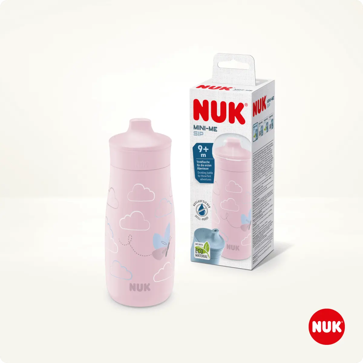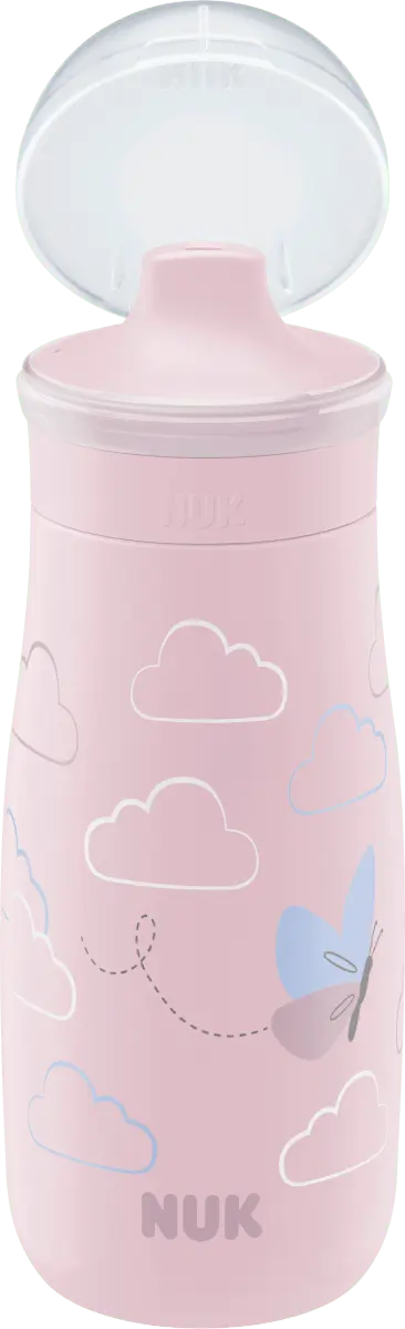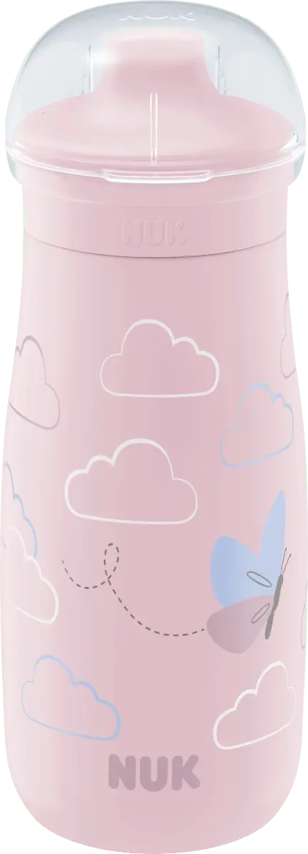 Бутылка-поилка NUK Mini-Me пастельно-розового цвета – надежный спутник на каждый день. Благодаря практичному защитному колпачку бутылочка идеальна для путешествий. Инновационная насадка для питья Sip особенно прочна и легко выдерживает мелкие острые зубы. Поилка имеет современный дизайн, подходит для детей от 9 месяцев и изготовлена ​​из небьющегося пластика с добавлением более чем на 80 % более экологичных материалов*. *Этот пластик представляет собой материал, происхождение которого на 100 % можно отнести к возобновляемому сырью с использованием сертифицированного метода баланса масс ISCC PLUS.