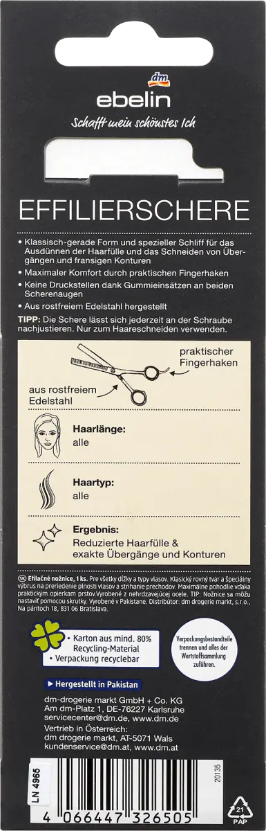 Классическая прямая форма и специальный срез для прореживания густоты волос, а также вырезания переходов и контуров челки. Максимальный комфорт благодаря практичным крючкам для пальцев. Отсутствие точек давления благодаря резиновым вставкам на обеих проушинах ножниц. Изготовлен из нержавеющей стали. СОВЕТ: Ножницы можно в любой момент отрегулировать с помощью винта. Используйте только для стрижки волос. Совет по уходу: Дезинфицируйте и очищайте после каждого использования тканью, смоченной имеющимся в продаже дезинфицирующим средством. Регулярное нанесение нескольких капель масла позволяет значительно улучшить функциональность ножниц, предотвратить преждевременный износ и тем самым продлить срок их службы.