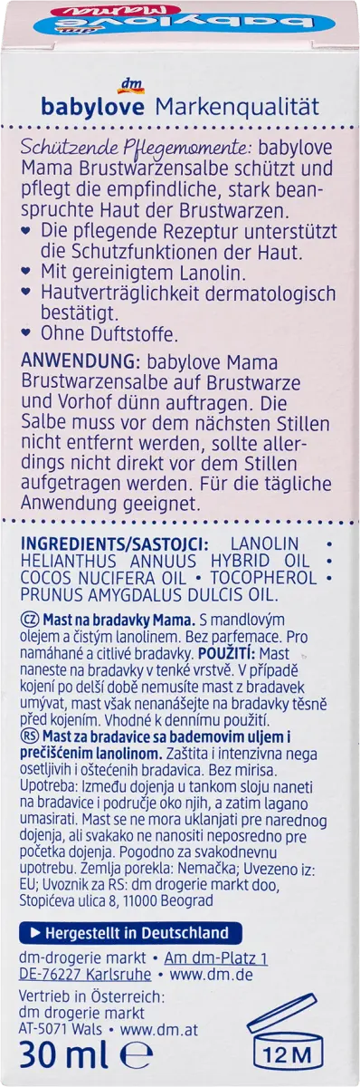 Нанесите тонкий слой мази для сосков babylove Mama на сосок и предсердие между интервалами между кормлениями грудью и аккуратно массируйте. Мазь не нужно удалять перед следующим кормлением грудью, но не следует наносить ее перед кормлением грудью. Подходит для ежедневного использования.