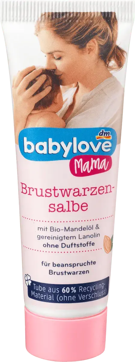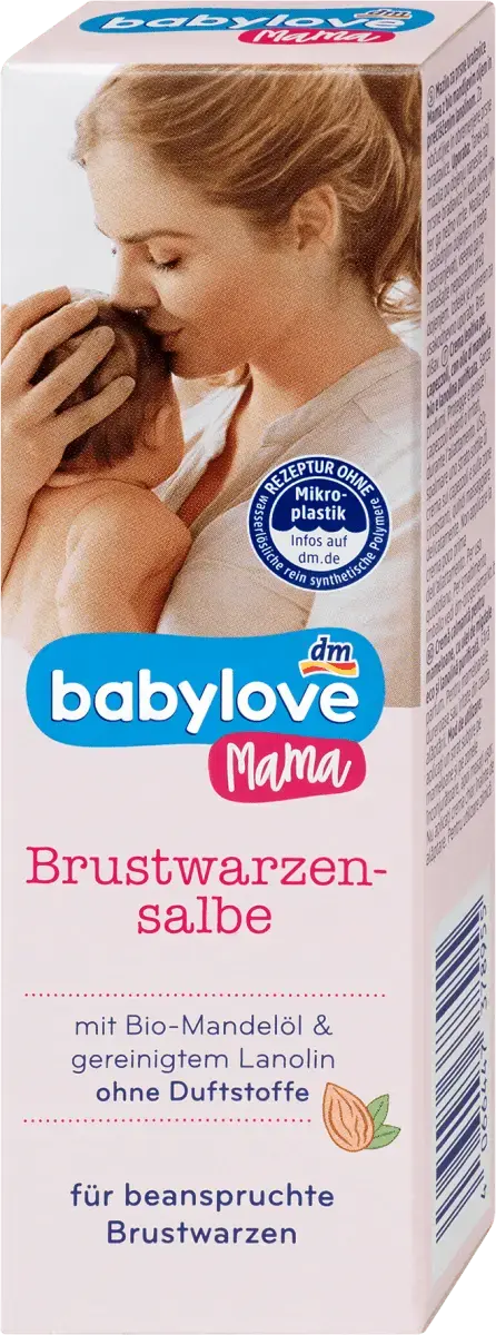 Моменты защитного ухода: мазь для сосков babylove Mama защищает и ухаживает за чувствительная, сильно напряженная кожа сосков. Питательная формула поддерживает защитные функции кожи. С органическим миндальным маслом. С очищенным ланолином. Совместимость с кожей одобрена дерматологами. Без ароматизаторов. Мазь не нужно удалять перед следующим кормлением грудью, но не следует наносить непосредственно перед кормлением грудью. Подходит для ежедневного применения – максимум 10 раз в день. Рецепт без микропластика и водорастворимых, чисто синтетических полимеров.