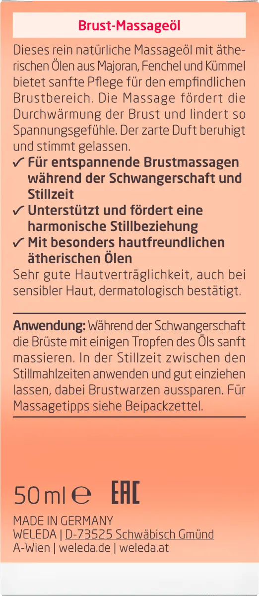 Питает и расслабляет грудь. Если грудь натянута, нежный массаж с маслом для кормления способствует кровообращению и согреванию тканей - это чувствует себя хорошо и расслабляется. Натуральные эфирные масла фенхеля, тмина и майорана традиционно используются во время грудного вскармливания для стимуляции выработки и притока молока. Применение: Массаж груди с использованием масла для грудного вскармливания рекомендуется уже на 38-й неделе беременности. Согрейте в руке немного масла, затем массируйте обе груди легкими поглаживающими движениями от основания груди к соску. Избегайте соска. В период грудного вскармливания расслабляющий массаж проводится между отдельными приемами пищи. Применение: Массаж с маслом для кормления Weleda поддерживает физиологические процессы выделения молока.