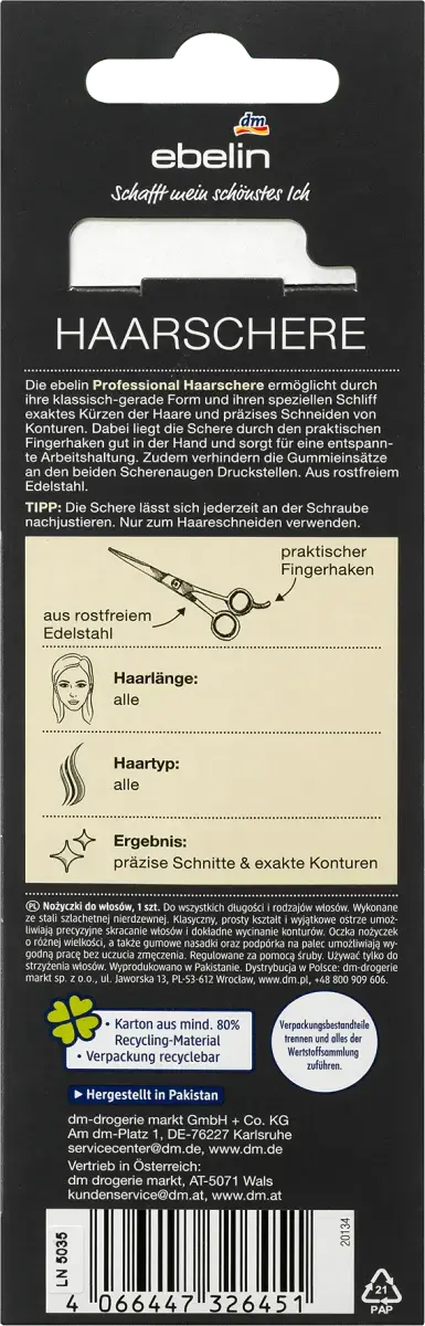 Стричь волосы дома теперь легко с профессиональными ножницами для волос от ebelin. Ножницы имеют классическую прямую форму и специальную форму для точного укорачивания волос и точного прорезания контуров. Благодаря практичному крючку для пальцев обеспечивается максимальный комфорт, а точки давления остались в прошлом благодаря резиновым вставкам на обеих ножницах.