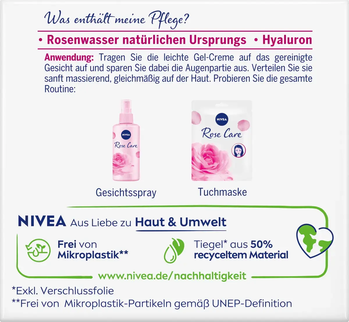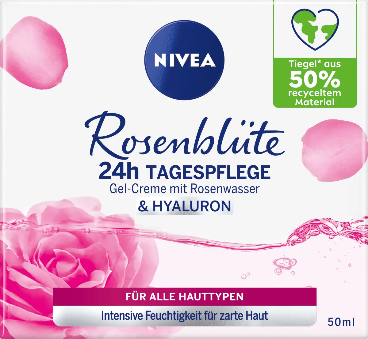 Дневной уход NIVEA Rose Flower с розовой водой натурального происхождения и гиалуроновой кислотой обеспечивает интенсивное увлажнение нежной кожи. Легкая гель-кремовая формула освежает кожу и особенно быстро впитывается. Кожу балует нежный аромат роз. Дневной уход, подходящий для всех типов кожи, включая чувствительную, оживляет кожу и обеспечивает сияющий, здоровый цвет лица.