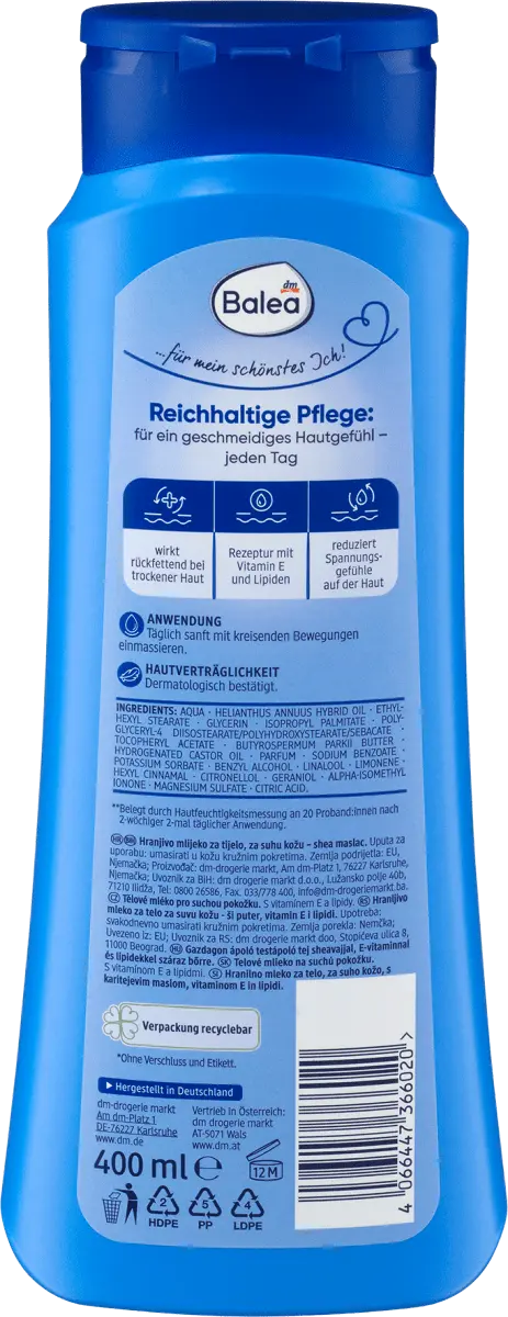 Насыщенное молочко для тела Balea возвращает важна влажность для сухой кожи. В то же время формула оказывает увлажняющий эффект, обеспечивая заметно гладкую кожу. Питательная формула с отборными липидами, витамином Е и маслом ши облегчает ощущение грубой и напряженной кожи, а формула Moisture Care 48 часов поддерживает естественный запас влаги в коже и защищает ее от высыхания. Насыщенная эмульсия интенсивно питает кожу и снимает чувство напряжения. Рецепт без микропластика и водорастворимых, чисто синтетических полимеров.