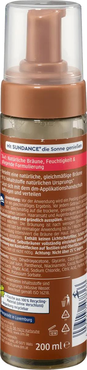 That SUNDANCE мусс для автозагара 3 в 1 обеспечивает естественный, ровный загар. Мусс с алоэ вера и кокосовой водой не оставляет пятен и быстро впитывается. Автозагар содержит витамин В3 и провитамин В5.