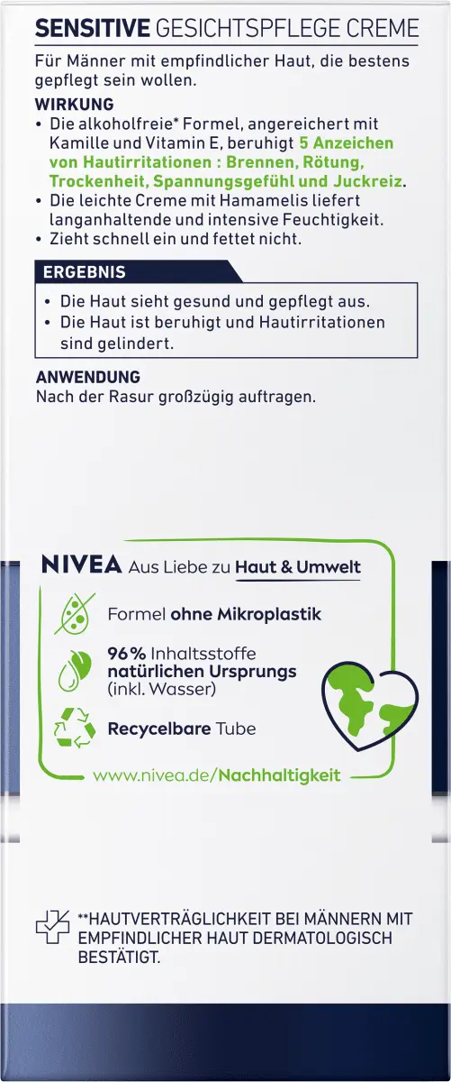 >Уход за лицом NIVEA Men Sensitive с ромашкой и гамамелисом не жжет, успокаивает и расслабляет. Предотвращается раздражение и покраснение. Кожа интенсивно увлажняется, повышается ее сопротивляемость.