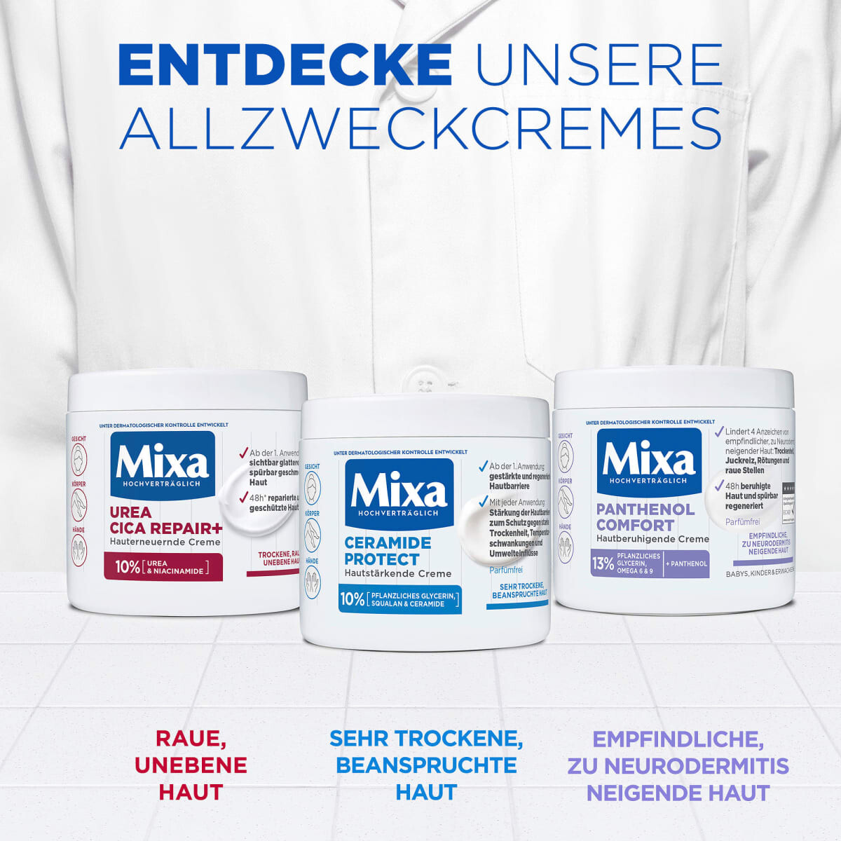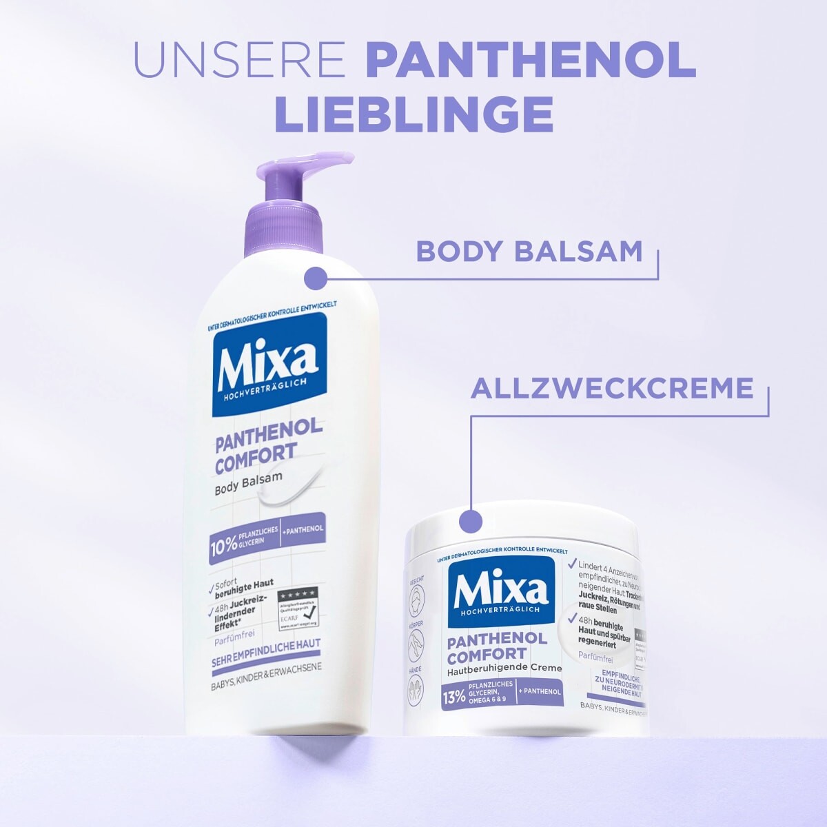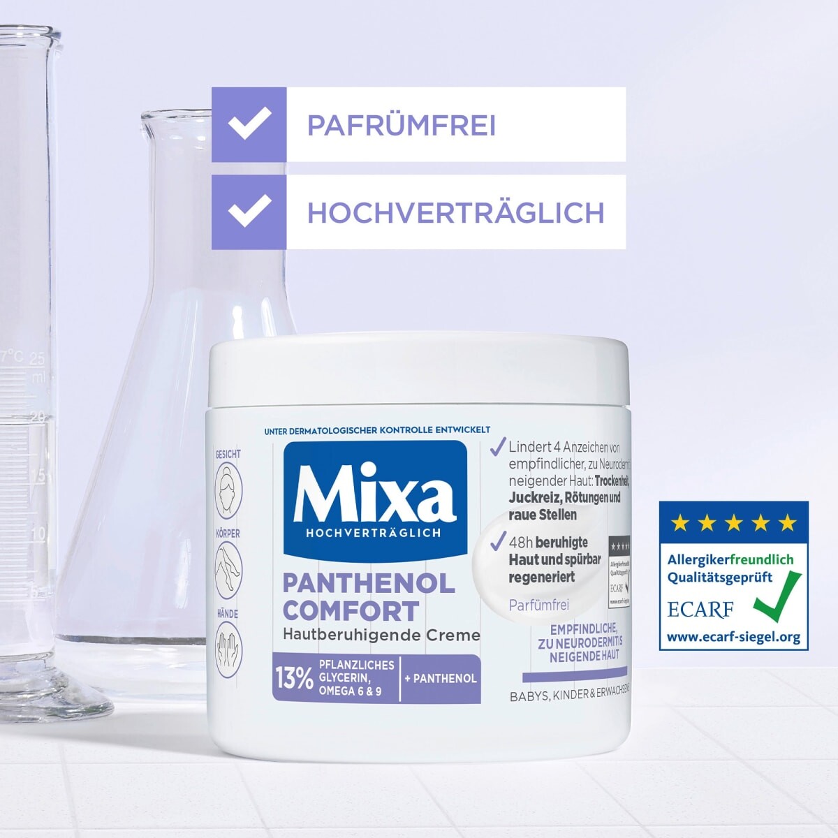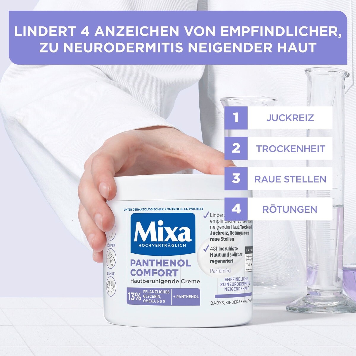 br>Успокаивающий крем для ухода Mixa Panthenol Comfort – нежное средство по уходу за лицом, телом и руками. Он специально разработан с учетом потребностей кожи, склонной к нейродермитам, и с первого применения делает кожу заметно более гладкой и упругой. Формула с пантенолом предотвращает зуд и покраснения. Благодаря быстро впитывающейся и нежирной текстуре крем-уход придает коже ощущение эластичности и надолго снимает чувство напряжения.