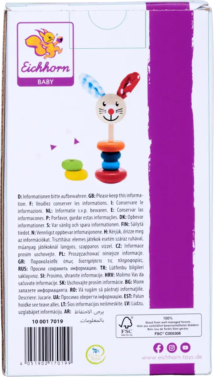 Откройте для себя вместе со своим ребенком эту детскую фигурку Эйххорна с мотивом кролика. Симпатичный подключаемый зверек-кролик состоит из 6 красивых красочных деревянных колец разных цветов. Таким образом, вы сможете поддержать своего ребенка с одного года.