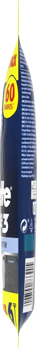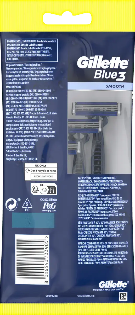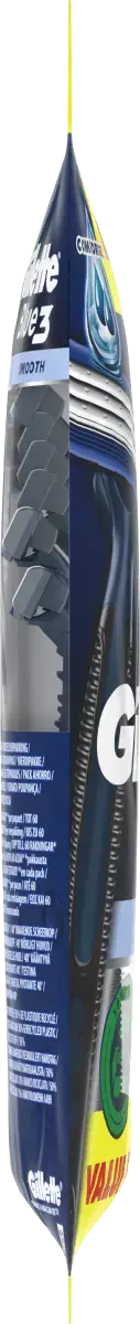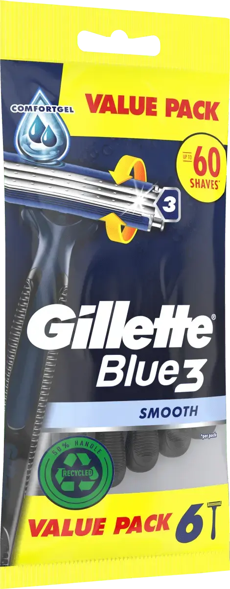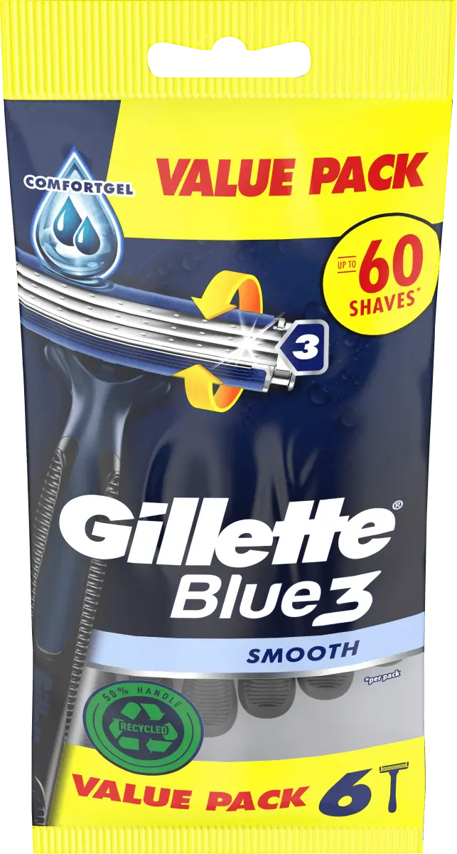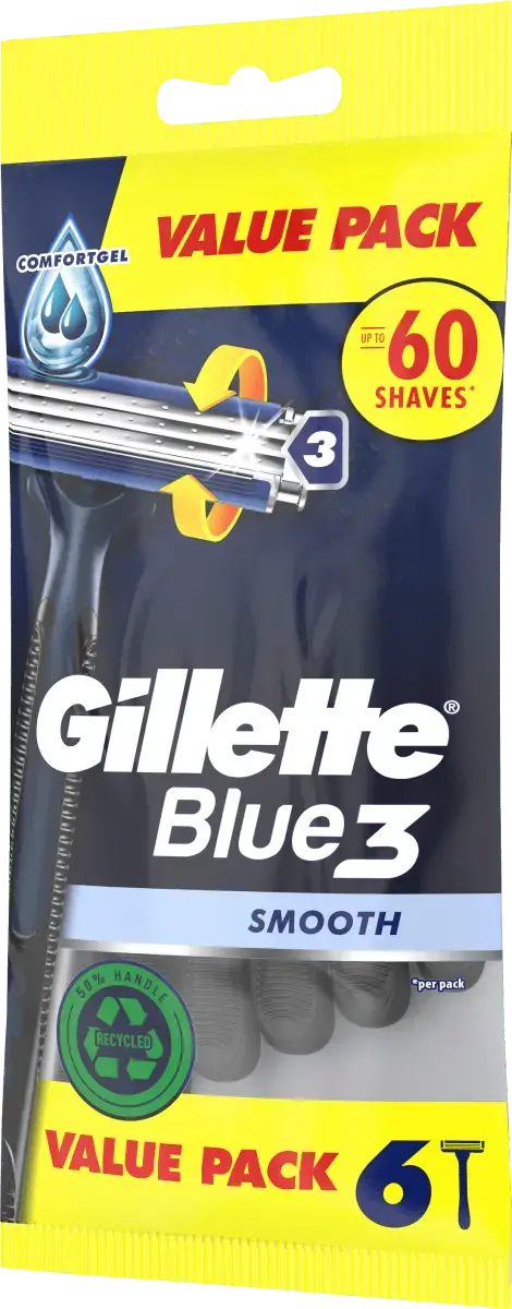 Одноразовая бритва Gillette Blue3 Smooth имеет 3 хромированных лезвия с датчиком состояния кожи и поворотную головку на 40°, которая адаптируется к контурам лица. Его высокоэффективная смазывающая полоска с активируемой водой технологией ComfortGel обеспечивает максимальный комфорт. Он оснащен нескользящей ручкой для лучшего контроля и в 2 раза легче очищать лезвия (по сравнению с Blue II Plus). Ручка на 50 % изготовлена ​​из переработанного пластика.