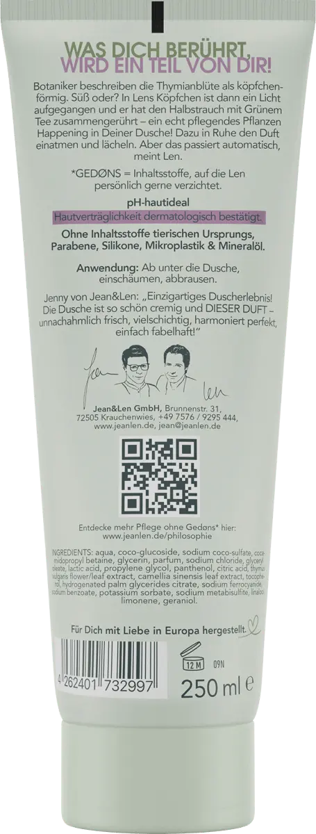 Гель для душа Green Tea Thyme от Jean&Len идеально подходит для нормальной кожи. Гель для душа обогащен мягким кокосовым маслом, растительным глицерином, пантенолом, экстрактом зеленого чая и тимьяна. Успокаивающий, пряный комплекс ухода гарантирует, что кожа будет чувствовать себя сбалансированной и приятной.