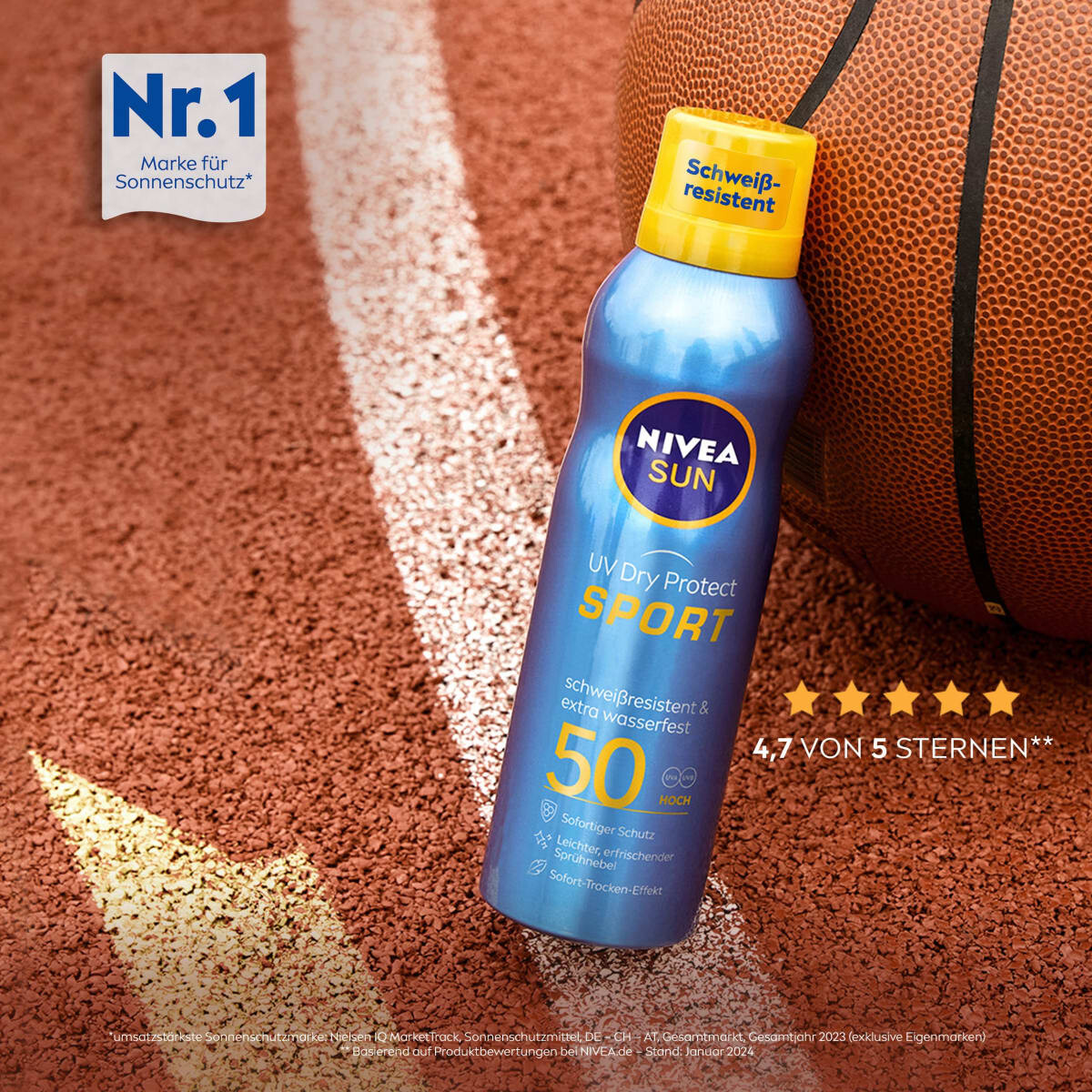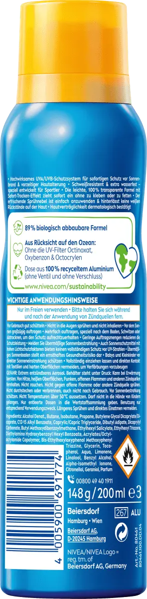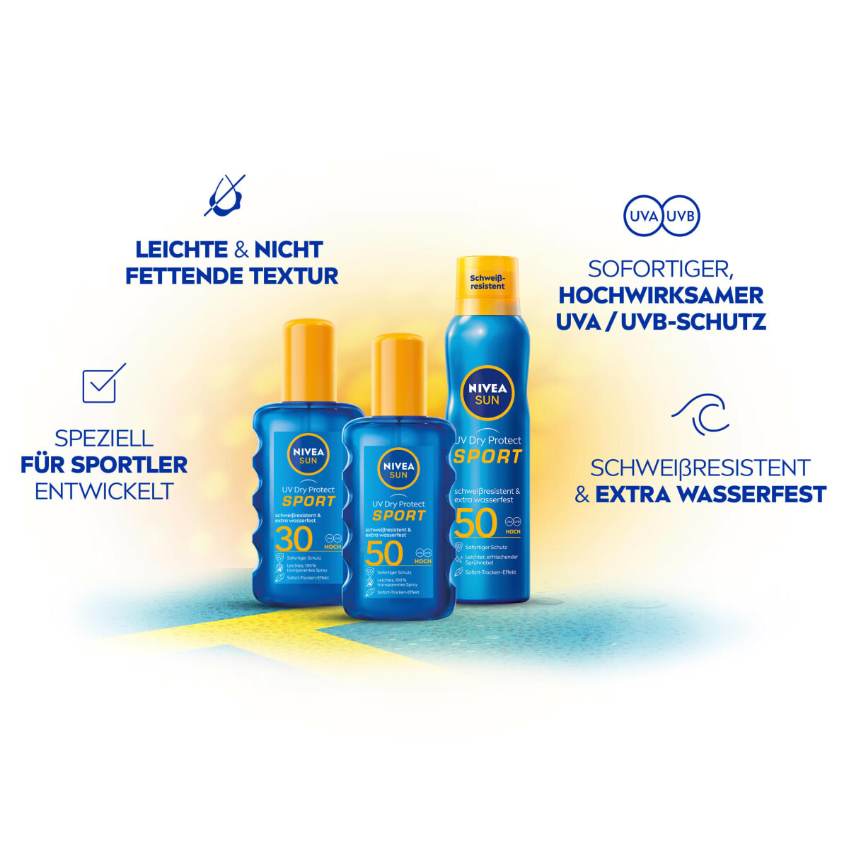 Новый солнцезащитный спрей NIVEA SUN UV Dry Protect с SPF 50 освежает кожу своим легким, невидимым аэрозольным туманом и обеспечивает немедленную и высокоэффективную защиту от UVA/UVB. Прозрачная формула оставляет на коже ощущение приятной сухости, поскольку мгновенно впитывается, не оставляя липкости и жирности, без каких-либо белых следов. Наслаждение для всех, кто много находится в движении.