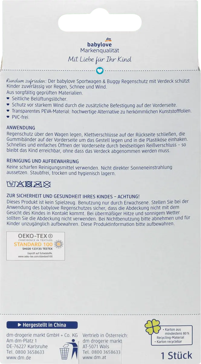 ДЛЯ БЕЗОПАСНОСТИ И ЗДОРОВЬЯ ВАШЕГО РЕБЕНКА – ВНИМАНИЕ! Этот продукт не является игрушкой. Использование только взрослыми. При использовании дождевика babylove следите за тем, чтобы чехол не касался лица ребенка. Не используйте чехол в жаркую и солнечную погоду. Когда он не используется, пожалуйста, снимите его и храните в недоступном для детей месте. Пожалуйста, сохраните эту информацию о продукте.