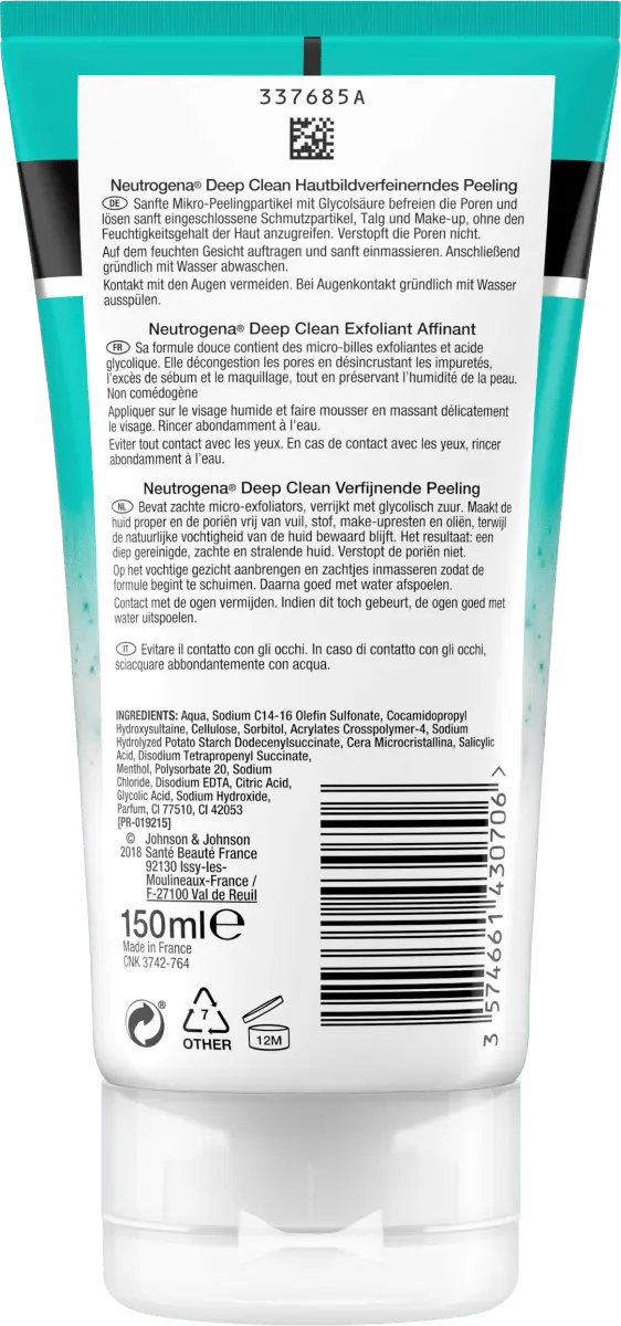 The Neutrogena Deep Clean Очищающий кожу пилинг содержит нежные частицы микропилинга с гликолевой кислотой. Они очищают поры и мягко растворяют захваченные частицы грязи, кожного сала и макияжа, не влияя на влажность кожи. Не закупоривает поры и подходит для всех типов кожи.