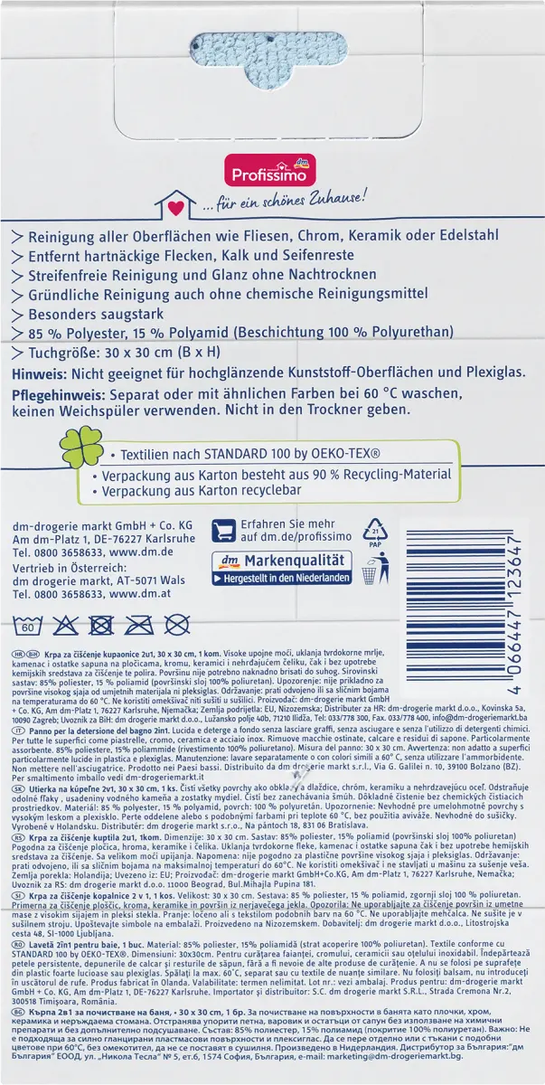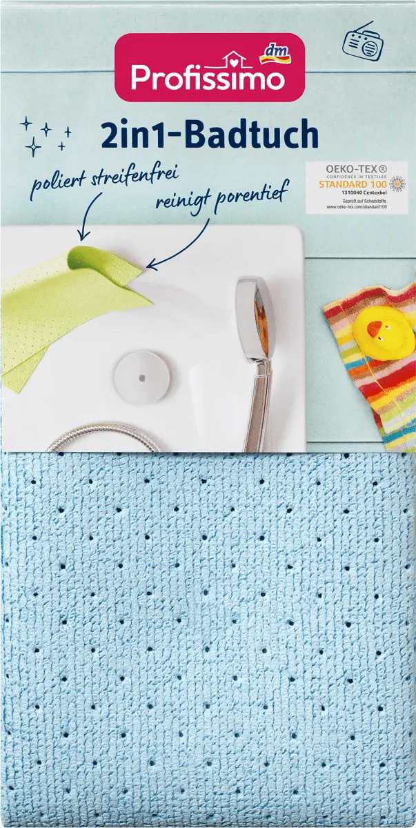 Идеально подходит банное полотенце 2-в-1 из серии Profissimo. для очистки всех поверхностей, таких как плитка, хром, керамика или нержавеющая сталь, и дает отличный результат даже без использования химических чистящих средств. Надежно удаляет стойкие пятна, известковый налет и остатки мыла. Размер ткани: 30 х 30 см.