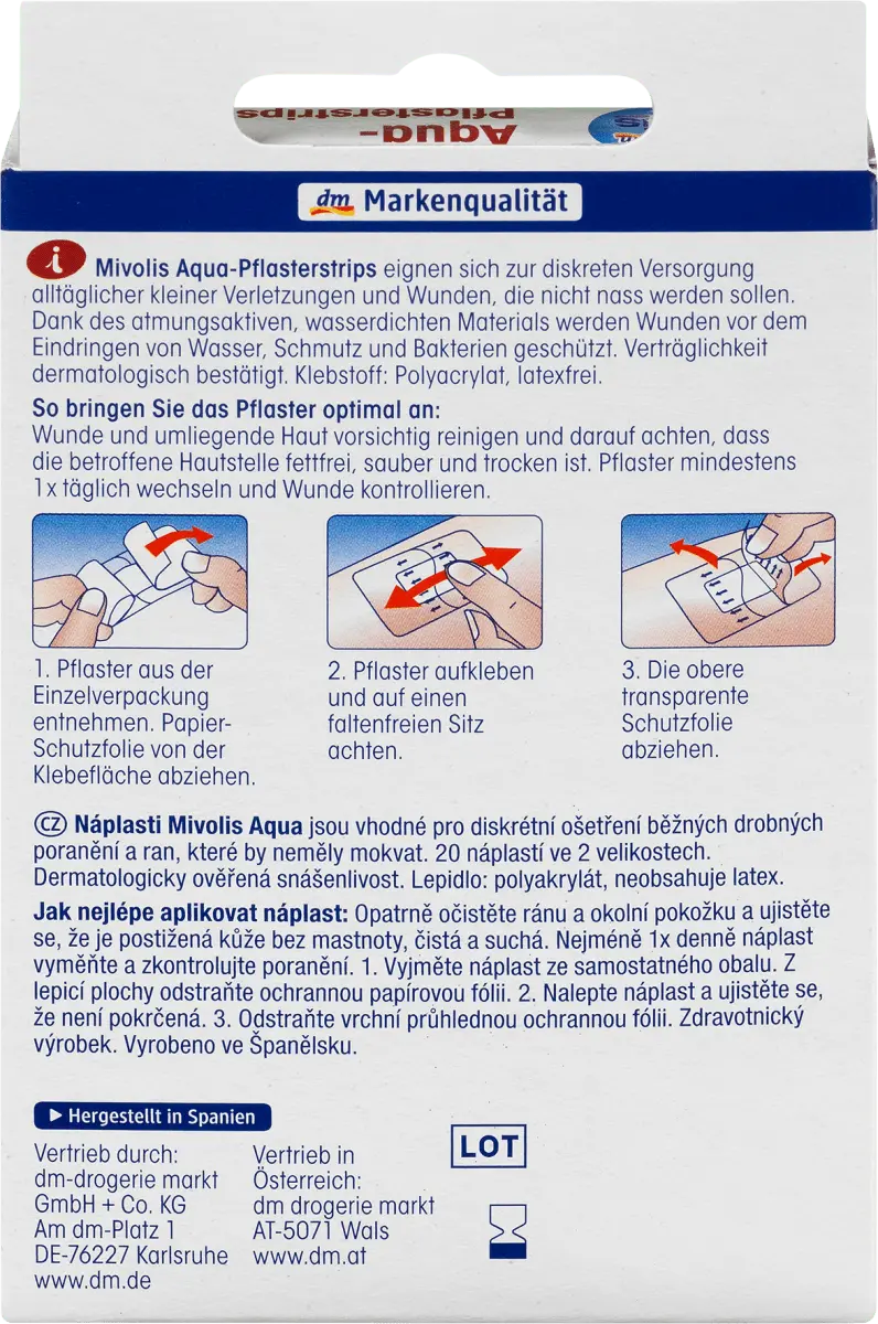 Полоски пластыря Mivolis Aqua подходят для незаметного ухода за небольшие, повседневные травмы и раны, которые нельзя мочить. Благодаря дышащему, водонепроницаемому материалу раны защищены от проникновения воды, грязи и бактерий. Совместимость подтверждена дерматологически. Клей: полиакрилатный, без латекса. 12 полосок 30 мм х 40 мм 8 полосок 40 мм х 60 мм