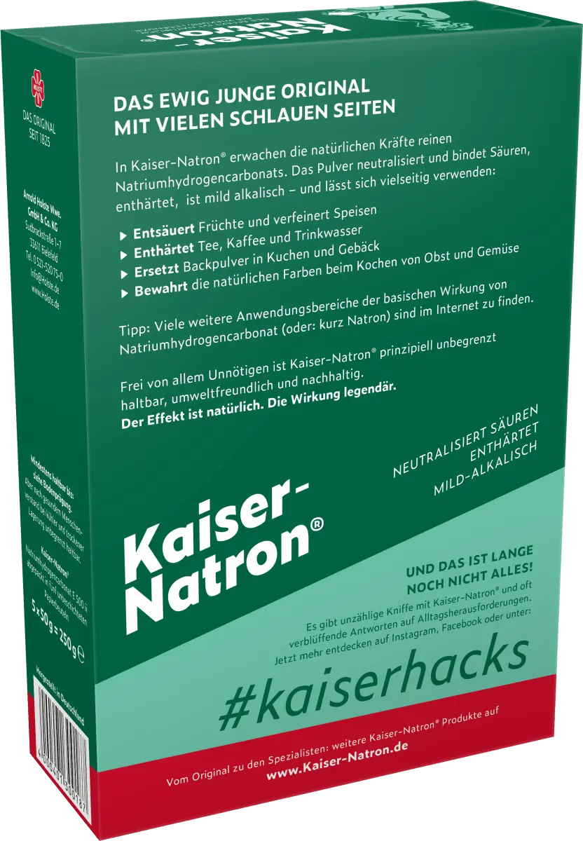 Порошок Kaiser-Natron в большой упаковке по 250 г – настоящий оригинал на все случаи жизни. Потому что пищевая сода — это замечательный ингредиент для ваших кулинарных успехов и сенсационной выпечки. Он также предлагает невероятное количество других опций.