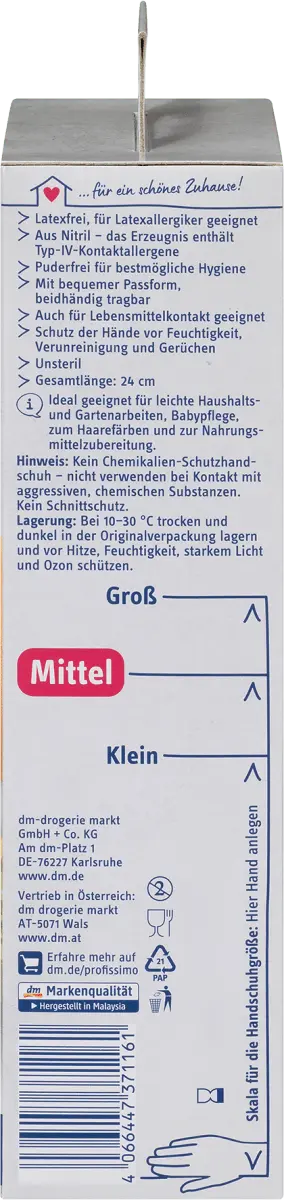 >Средними белыми одноразовыми перчатками из нитрила от Profissimo ваши руки оптимально защищены в самых разных ситуациях. Перчатки идеально подходят для легкой работы в саду, ухода за детьми, окрашивания волос и приготовления пищи. Они также идеально подходят для работы с пищевыми продуктами. Они также не содержат латекса, что делает их подходящими для людей с аллергией на латекс. Защитите свои руки одноразовыми перчатками Profissimo. Для большей гигиены в домашнем хозяйстве.