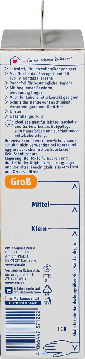 Черные одноразовые перчатки Profissimo Large из нитрила, не содержащие латекса, защищают руки от влаги, загрязнений и запахов. Они не содержат латекса, что делает их подходящими для людей с аллергией на латекс. Идеально подходит для легкой работы в саду, ухода за детьми, окраски волос и приготовления пищи. Не химзащитная перчатка – не использовать при контакте с агрессивными химическими веществами. Без защиты от порезов.