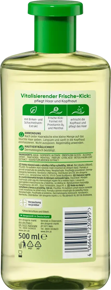 Тоник для волос из березы от Balea обеспечивает оживляющую свежесть. Питает волосы и кожу головы. Формула свежести с провитамином B5 и ментолом освежает кожу головы и питает волосы.
