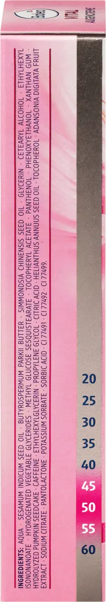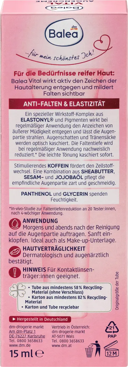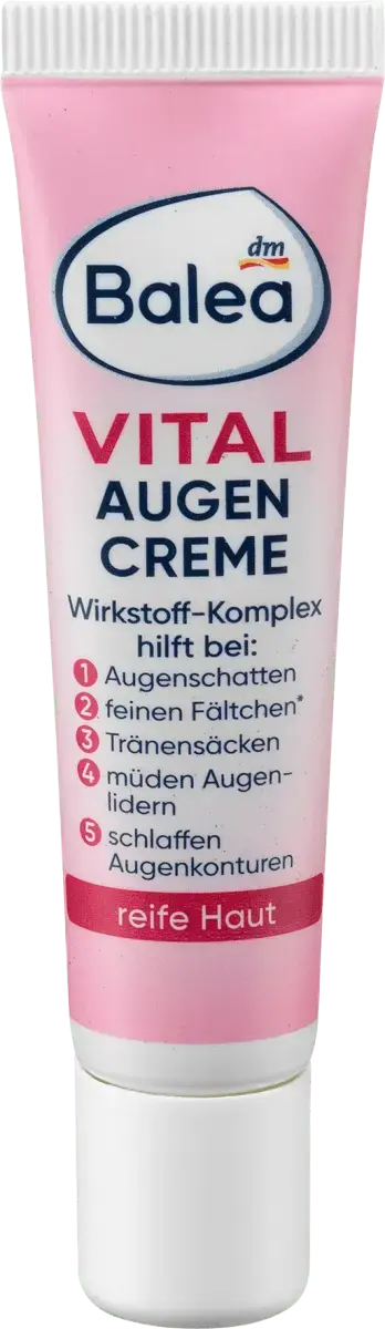 Для нужд зрелой кожи: Balea Vital активно противодействует признакам старения кожи и заметно уменьшает морщины. При регулярном использовании специальный комплекс активных ингредиентов из ELASTONYL и пигментов противодействует признакам внешней усталости и придает коже сияния. Темные круги под глазами и мешки под глазами оптически скрываются. При регулярном использовании глубина морщин заметно уменьшается.* Светлый оттенок мгновенно скрывается. Стимулирование КОФЕИНА способствует клеточному метаболизму. Комбинация МАСЛА ШИ, КУНЖУТА и МАСЛА ЖОЖОБА сохраняет чувствительную область вокруг глаз мягкой и эластичной. ПАНТЕНОЛ и ГЛИЦЕРИН обеспечивают увлажнение. * Исследование in-vivo по уменьшению глубины морщин с участием 20 тестеров после 4 недель использования. Состав без микропластика и водорастворимых, чисто синтетические полимеры.
