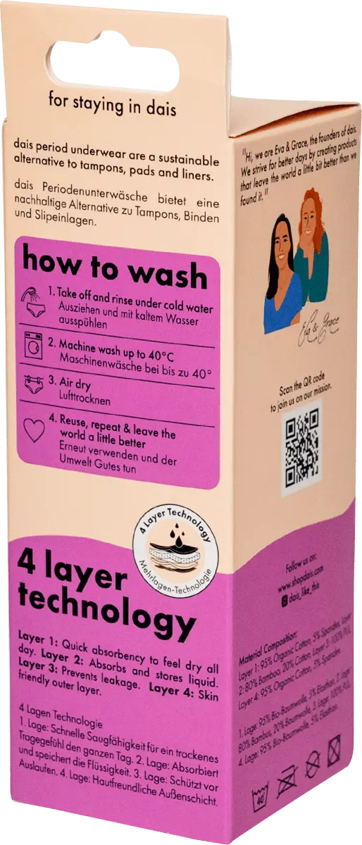 Инструкция по стирке : 1. Снимите и промойте холодной водой. 2. Машинная стирка при температуре до 40°. 3. Высушите на воздухе. 4. Используйте снова и наносите пользу окружающей среде. Можно стирать при температуре до 40°. Не гладить. Не подвергать химической чистке. Не сушить в сушильной машине. Нижнее белье можно носить до 12 часов. Перед первым использованием постирайте.