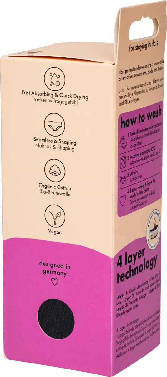 Бесшовное нижнее белье «Хипстер» от помоста в размере М – идеальная альтернатива прокладкам и тампоны. Веганское нижнее белье черного цвета содержит исключительную многослойную технологию. Слои обеспечивают комфортное и сухое ношение благодаря быстрому впитыванию, практичному хранению жидкости и превосходной защите от протечек.