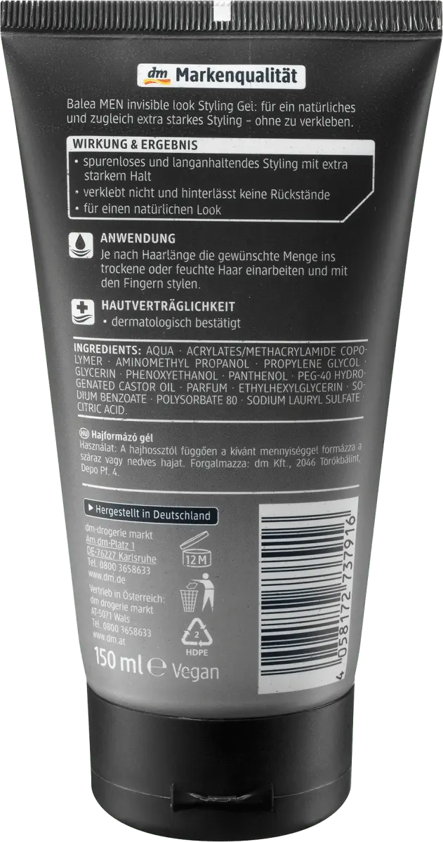 Гель для укладки волос Balea MEN Invisible Look обеспечивает очень сильную фиксацию без прилипания (уровень 6). и позволяет создавать укладки без следов. Это значит, что ваш внешний вид будет естественным, а укладка сохранится надолго — с очень сильной фиксацией и отсутствием следов.