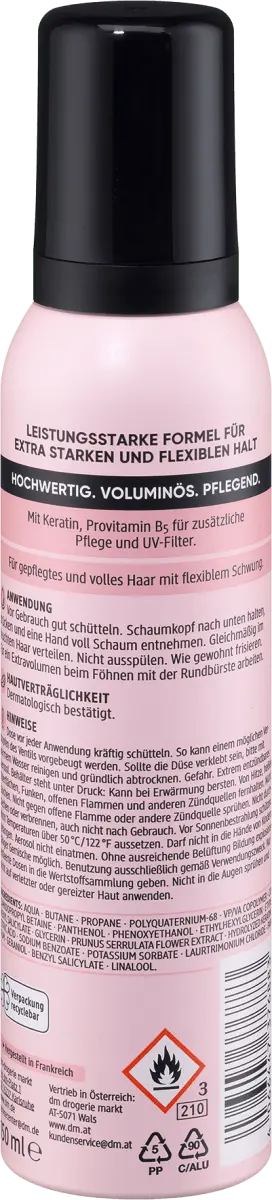 The Balea Профессиональный мусс keratin & Volume экстрасильной фиксации укрепляет и насыщает волосы кератином, провитамином В5, защищает их от нагрева до 220° и УФ-излучения. С 48-часовой фиксацией – идеален для стойкой и объемной укладки. Нежная пена обеспечивает мощную фиксацию в течение всего дня, не прилипая и не утяжеляя, ее легко расчесывать.