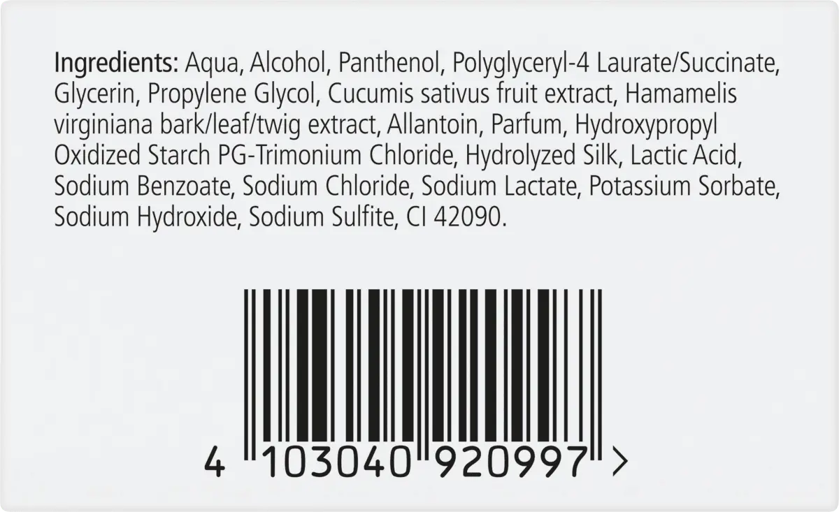 Состав: Аква, Спирт, Пантенол, Полиглицерил-4 Лаурат/ Сукцинат, глицерин, пропиленгликоль, экстракт плодов Cucumis sativus, экстракт коры/листьев/веточек гамамелиса виргинского, аллантоин, отдушка, гидроксипропилоксидированный крахмал, PG-тримониумхлорид, гидролизованный шелк, молочная кислота, бензоат натрия, хлорид натрия, лактат натрия, сорбат калия. , Гидроксид натрия, Сульфит натрия, CI 42090.