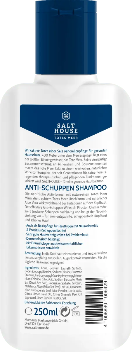 Перхоть- свободная кожа головы и красивые волосы: шампунь Salthouse Dead Sea сочетает в себе натуральную активную формулу с настоящей грязью Мертвого моря и увлажняющим алоэ вера. 100% натуральные минералы Мертвого моря помогают при раздражениях кожи головы. Эффективный активный ингредиент против перхоти пироктон оламин устойчиво уменьшает сухую перхоть и предотвращает образование новой. Этот продукт веганский.