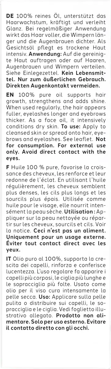 При использовании на волосах распределите на кожу головы и волосы, оставить на 15 минут и тщательно смыть. При использовании на ресницах и бровях нанесите небольшое количество масла на брови или ресницы вечером после очищения и оставьте на ночь. Избегайте прямого зрительного контакта. При использовании в качестве масла для лица наносите на очищенную кожу по мере необходимости и слегка массируйте. ПРИМЕЧАНИЕ: Не еда. Только для наружного применения. Избегайте прямого зрительного контакта.