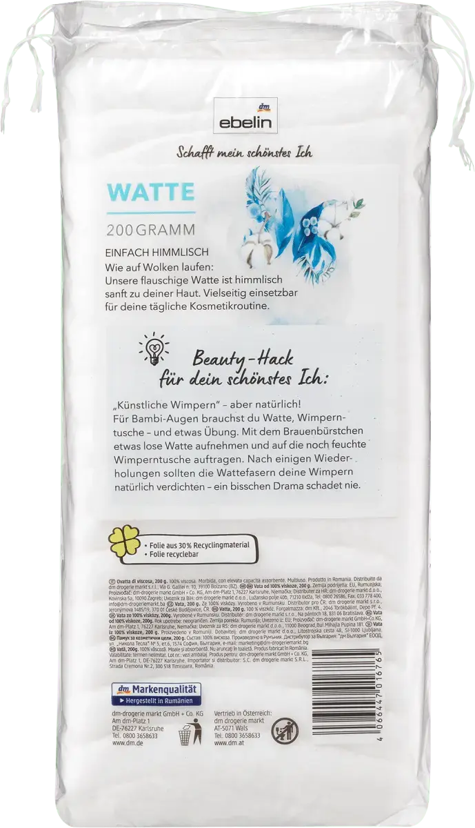 вата ebelin идеально подходит для ежедневной косметики, гигиены, ухода за лицом и телом. Супермягкий, нежный и впитывающий. Также подходит для чистки и ухода за нежной детской кожей.
