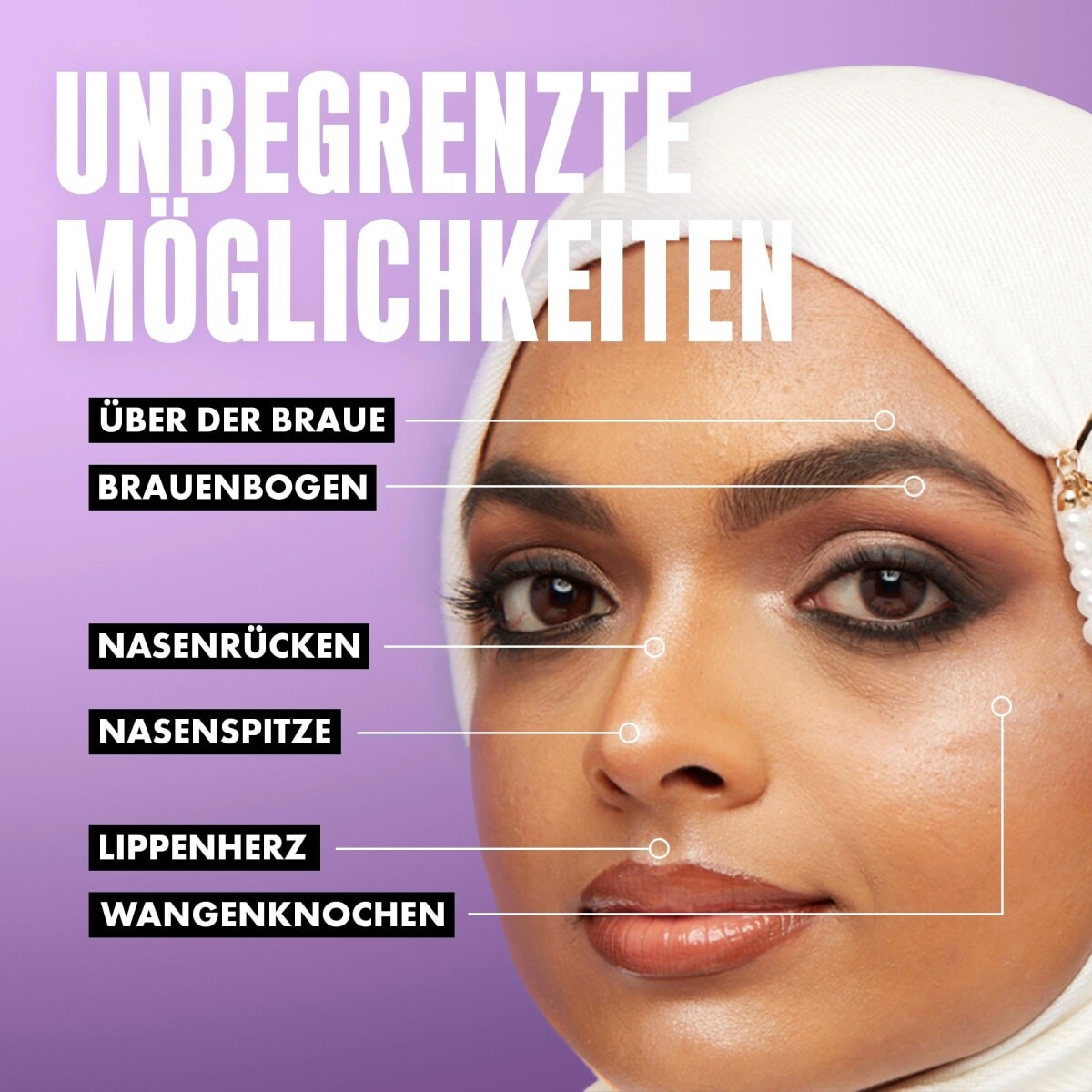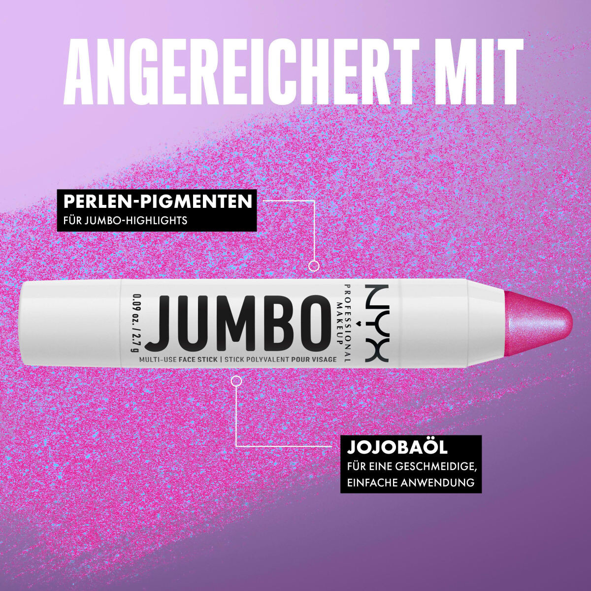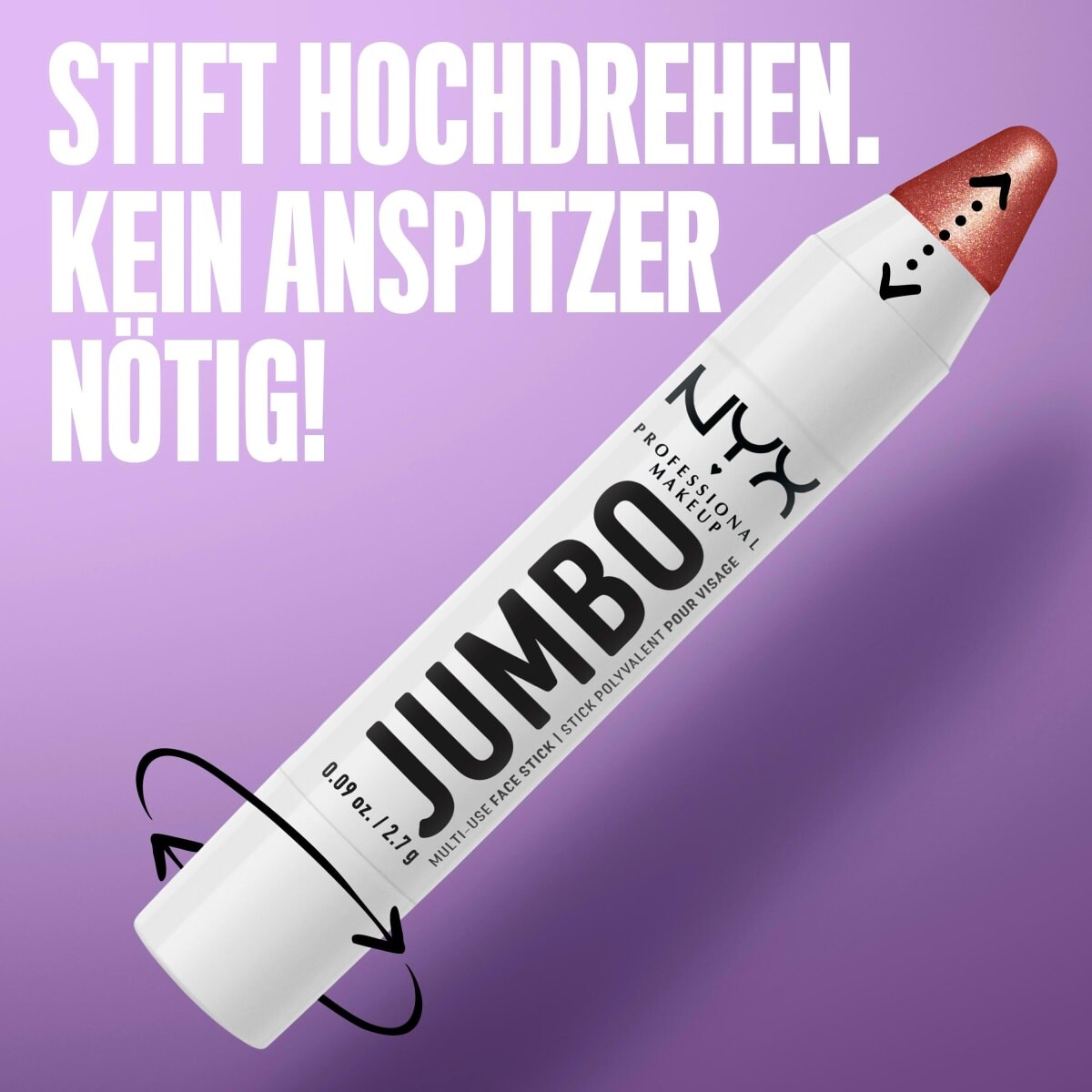 Вот как работает эффект мерцающего свечения с помощью Jumbo Face Stick: нанесите Multi Use Придерживайтесь нужного участка лица – будь то веки, щеки или губы. При необходимости растушуйте пальцами или профессиональной кистью для макияжа. Наконечник уже изношен? Нет проблем! Гриф пера можно вращать. Затем можно продолжить макияж.